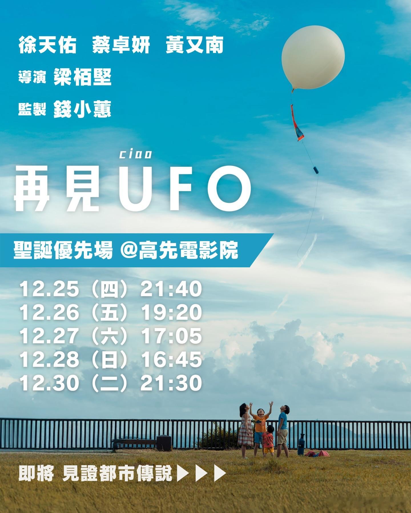 于2018年杀青的《再见UFO》也要上映了!片方安排了年尾优先场,估计是要冲明年金像奖。电影由徐天佑、蔡卓妍、黄又南、卫诗雅、吴肇轩、梁雍婷、梁祖尧、白只、朱栢康出演。简介:1984年,香港仔华富邨曾经有UFO低空飞过的都市传说,轰动一时。三个少年陈子健、何家谦、林可怡是当年的目击者,随着各人成长,性格迥异的三人都有着不同的人生轨迹。这时香港正经历天翻地覆的改变,80年代的希望,90年代的浮躁,都落于千禧的苍白里。当三个成长伙伴再聚首,早已认不出自己,也早已认不出香港。受尽冲击的他们不禁问,当年在天台看见的神秘光芒,到底是什么?