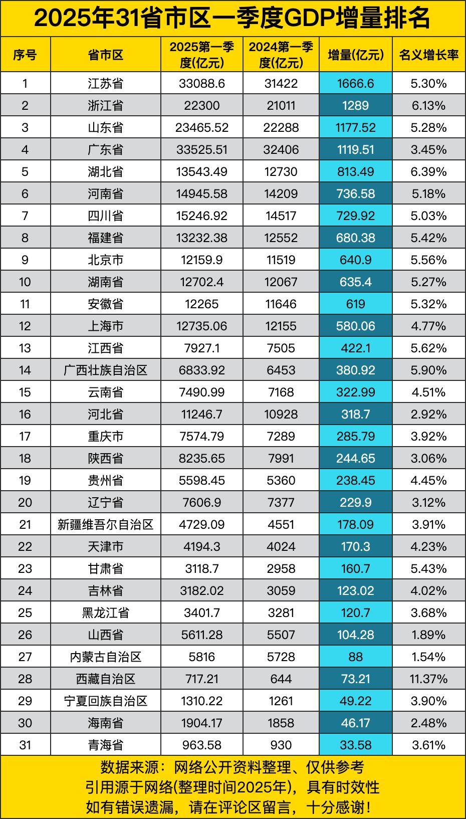 乍一看榜单,感觉就像在看一场省际马拉松——有人一路狂飙甩开膀子冲,有人不紧不慢跟着大部队,还有人喘着气在后面努力追赶。江苏老大哥以1666亿的增量霸气领跑,这新增的量都快赶上有些省份一季度总量了,真可谓是“家里有矿,心里不慌”。浙江和山东这两位优等生也紧随其后,增量都破了千亿,尤其是浙江,增速还跑赢了江苏,一副“我总量不如你,但势头比你猛”的架势。不过最让人意外的,是常年稳坐总量头把交椅的广东,这回增量虽排第四,但增速只有3.45%,仿佛在说:“我先调整下呼吸,你们前面冲。” 如果说前面几位是“实力派选手”,那中间梯队的剧情就更丰富了。湖北、河南、四川、福建这些“中坚力量”,增量都在600亿到800亿之间,咬得非常紧,像极了班里成绩差不多的几个同学,每次考试排名都要换一换。北京、湖南、安徽、上海也稳扎稳打,贡献了五百亿上下的新增量。不过上海4.77%的增速在一众经济大市里不算起眼,看来这座“东方明珠”今年开局选择了“稳健模式”。倒是江西、广西这些省份,增速亮眼,特别是广西,逼近6%的增长率,颇有几分“闷声发小财”的意味。 再看榜单后半段,那真是“众生百态”。西藏虽然增量只有73亿,但11.37%的增速一骑绝尘,堪称“增速王者”,完美诠释了什么叫“基数小、跑得快”。而山西、内蒙古的增速不到2%,仿佛还没从冬眠中完全苏醒。河北、辽宁这些老工业基地,增速也在3%左右徘徊,转型之路看来还需加把劲。海南的增速只有2.48%,与其旅游热岛的形象有点反差,难道大家一季度都宅在家里没出门?这区域之间的温差,确实比天气还明显。 总体来看,这份一季度成绩单,描绘的是一幅“东部领跑、中部紧追、西部有亮点也有挑战”的动态图景。有的省份在拼质量,有的在冲速度,还有的在艰难转身。全国经济这盘大棋,每一个省份都是一颗重要的棋子,节奏不同,角色各异。但无论如何,比赛才刚开始第一季度,后续三个季度,是“强者恒强”,还是“黑马频出”,抑或是“后来居上”?这场关乎发展的大考,值得我们搬好小板凳,持续关注。毕竟,发展不是短跑,比的更是持久的耐力和转型的智慧。
