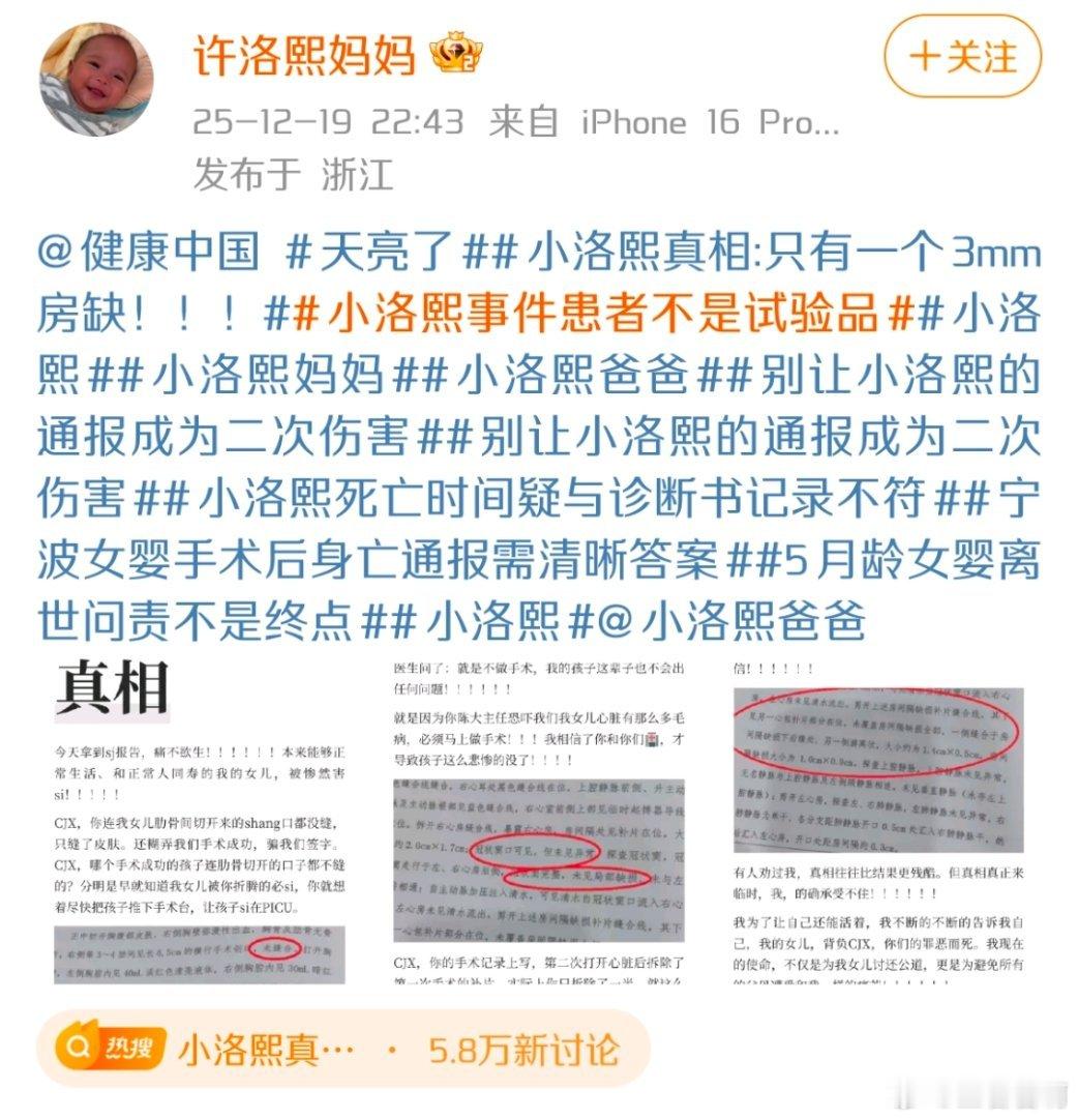 王者君啊大半夜刷某音看到 小洛熙尸检结果有了 看着洛熙妈妈的控诉字字泣血,太让人心疼了!明明是无需手术的小问题,却被医生夸大风险逼上手术台,术后还留下一堆致命操作漏洞。医者仁心不该是句空话,拿着患者的信任和生命谋利,这样的失德行为必须被钉在耻辱柱上!支持家属维权到底,一定要为孩子讨回公道!