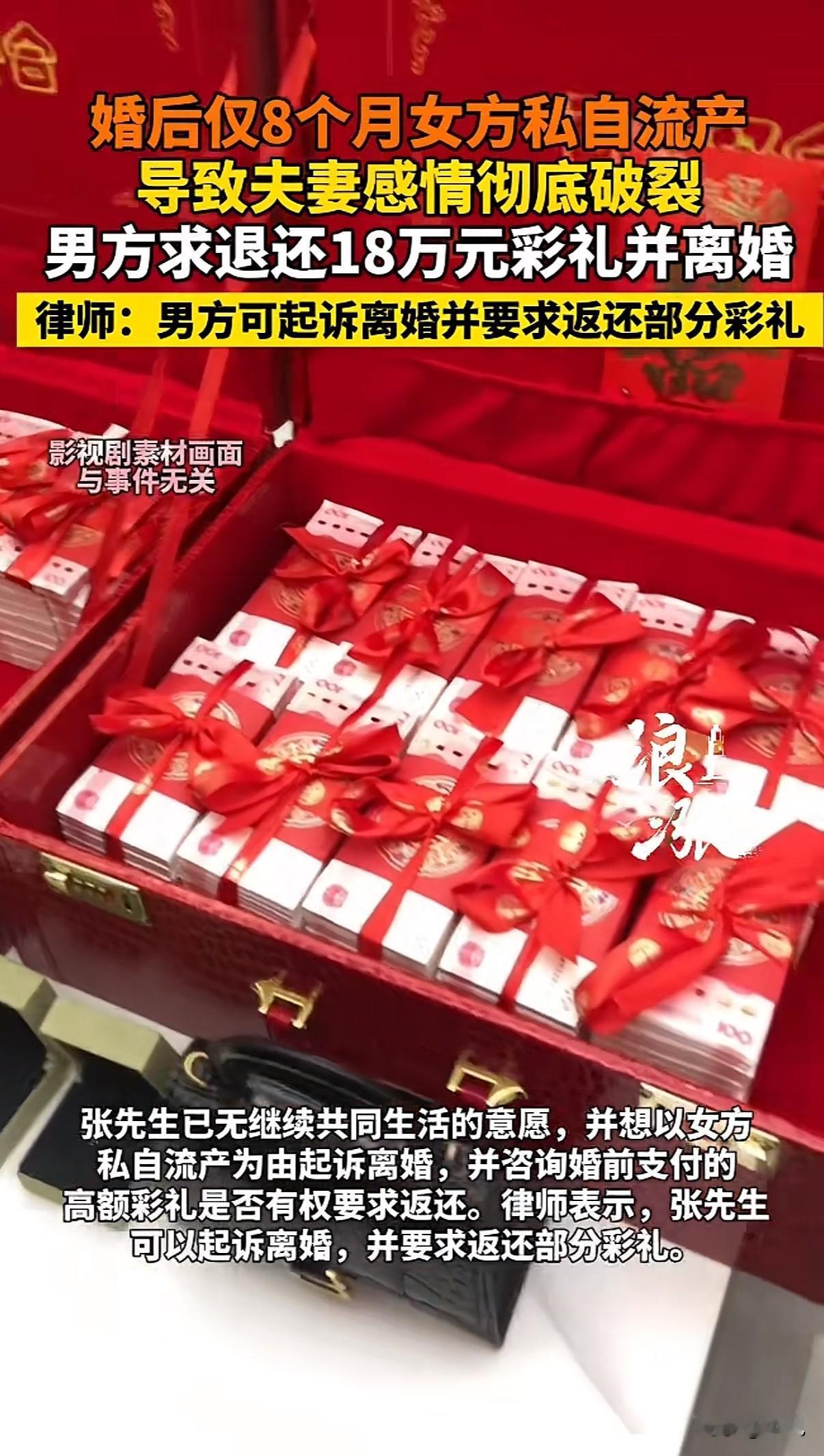 婚后8个月,妻子擅自流产,丈夫怒了:离婚,18万彩礼必须退! 张先生结婚时按习俗给了18万彩礼,婚后和妻子共同生活8个月。结果妻子没跟他商量,就把孩子打掉了,两人感情彻底破裂。 张先生不想过了,要离婚,还想把18万彩礼要回来。 律师说,张先生可以起诉离婚,还能要求返还部分彩礼。因为法律规定,夫妻因是否生育产生纠纷导致感情破裂的,法院调解无效会判离。 至于彩礼,虽然登记结婚且共同生活一般不支持返还,但张先生这情况特殊——共同生活时间短、彩礼数额高,且离婚因女方行为导致。所以法院会结合当地习俗、彩礼实际使用情况等来判定返还数额。 有人觉得妻子擅自流产不对,彩礼该退;也有人觉得结婚且共同生活了,不该退。你站哪一边?