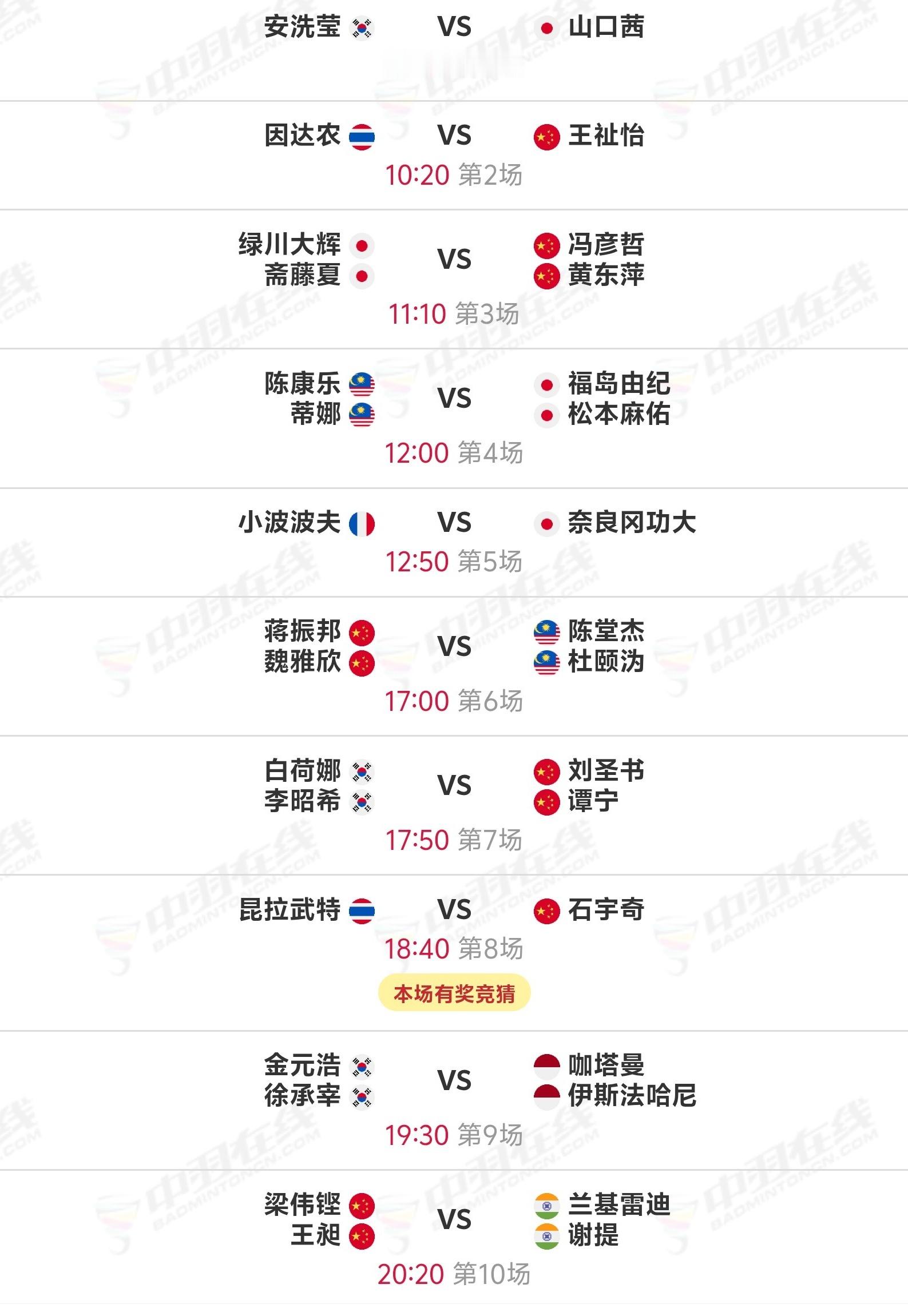 2025年世界羽联年终总决赛 12月20日半决赛赛程: 【9点30分开始】1、安洗莹🇰🇷 vs 🇯🇵山口茜2、王祉怡🇨🇳 vs 🇹🇭因达农3、冯彦哲/黄东萍🇨🇳 vs 🇯🇵绿川大辉/斋藤夏4、陈康乐/蒂娜🇲🇾 vs 🇯🇵福岛由纪/松本麻佑5、小波波夫🇫🇷 vs 🇯🇵奈良冈功大【17点开始】1、蒋振邦/魏雅欣🇨🇳 vs 🇲🇾陈堂杰/杜依蔚2、刘圣书/谭宁🇨🇳 vs 🇰🇷白荷娜/李绍希3、石宇奇🇨🇳 vs 🇹🇭昆拉武特4、金元浩/徐承宰🇰🇷 vs 🇮🇩咖塔曼/伊斯法哈尼5、梁伟铿/王昶🇨🇳 vs 🇮🇳兰基雷迪/谢提
