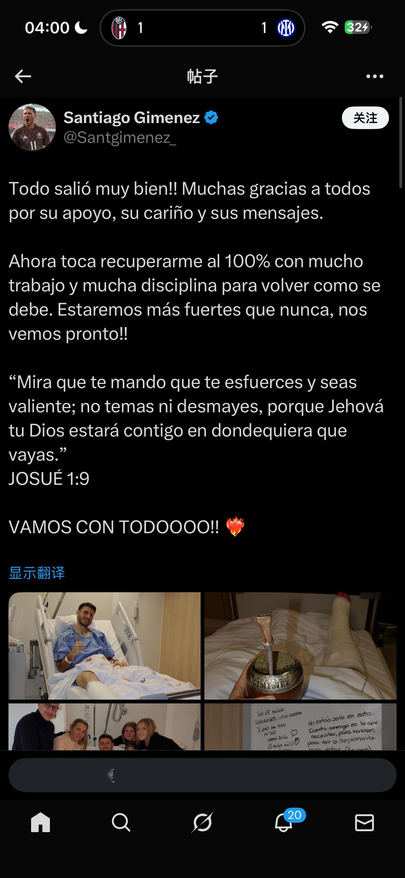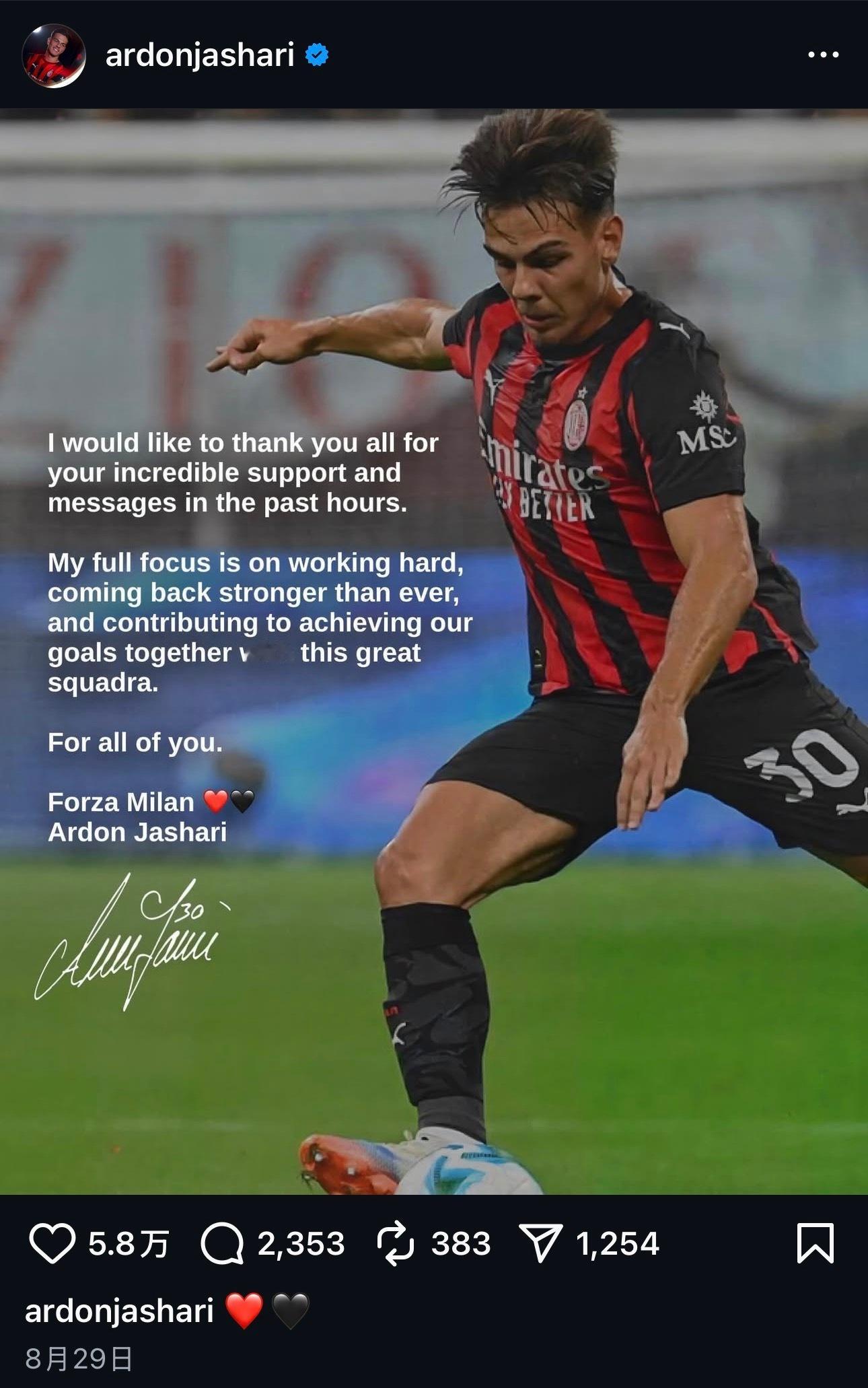 【圣地亚哥最新社媒】一切都很顺利!!非常感谢大家的支持、关爱和留言。现在我要以十足的努力和自律完全康复,以应有的状态回归。我们会比以往更强大,我们很快再见!“你当刚强壮胆;不要惧怕,也不要惊惶,因为你无论往哪里去,耶和华你的神必与你同在。”——约书亚记 1:9 冲啊,全力以赴!!❤️🔥圣地亚哥这段内容“米兰含量”“红黑元素”可以说几乎是0吧,现在他基本除了肉体合同属于米兰,我不知道“心”有多少属于米兰。如果你觉得我想多了,你可以看看图2亚沙里伤病官宣后怎么报平安是怎么说的——我要感谢大家在过去几个小时里给予的无比支持和留言。我会全身心投入刻苦训练,力求以更强大的姿态回归,与这支出色的球队并肩作战,为实现我们的目标贡献力量。为了你们所有人。——加油,米兰 ❤️🖤阿尔东·亚沙里从图片、排版、表情符号、内容表达,只要不瞎我觉得都能看出来区别吧我又对“造点排行榜2的哥哥”“怀揣恶意”了大圣聊球大圣聊球AC米兰ac米兰
