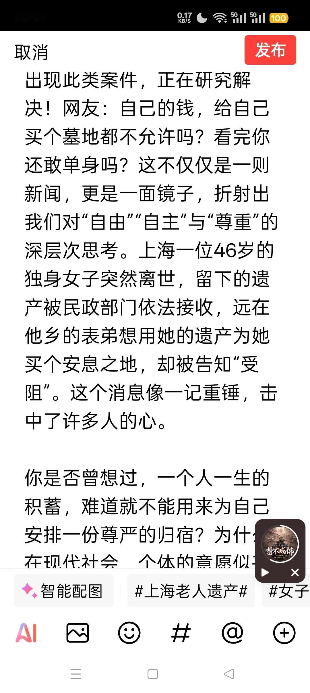 看完你还敢单身吗?上海icon46岁独身女子突然病逝,遗产由民政部门依法接收,远方表弟想用她的遗产买个墓地都受阻!民政部门回应:首次出现此类案件,正在研究解决!网友:自己的钱,给自己买个墓地都不允许吗?看完你还敢单身吗?这不仅仅是一则新闻,更是一面镜子,折射出我们对“自由”“自主”与“尊重”的深层次思考。上海一位46岁的独身女子突然离世,留下的遗产被民政部门依法接收,远在他乡的表弟想用她的遗产为她买个安息之地,却被告知“受阻”。这个消息像一记重锤,击中了许多人的心。 你是否曾想过,一个人一生的积蓄,难道就不能用来为自己安排一份尊严的归宿?为什么在现代社会,个体的意愿似乎变得如此脆弱?难道我们真的要等到“生命终点”到来时,才被告知“钱不能用在自己身上”?这背后隐藏的,是对个人自主权的剥夺,还是制度对“公共利益”的无限放大? 有人说,这是“法律的规矩”,必须严格执行;有人觉得,这是“尊重社会秩序”的表现。而我想问:当法律变成了束缚个体自由的枷锁,我们是否还在追求“公平”?当“公共利益”成为剥夺个人权益的借口,谁来为普通人发声?难道我们要在“制度的铁幕”下,放弃对自己生命最后一份尊重吗? 更令人愤怒的是,网友们的反应也极具代表性。有的说:“自己的钱,买个墓地都不允许?”有的则担心“会被滥用、被剥夺”。但归根结底,这反映出的是一种普遍的焦虑:我们对“自主权”的渴望与制度的束缚之间的拉锯。 这件事不仅仅是个孤例,而是折射出社会对个人权益的模糊认识。我们需要的是一种尊重个体意愿、保障个人权益的制度创新,而不是一味强调“公共利益”而忽视了个人的最后尊严。 或许,这个故事会让你开始反思:在这个快速变化的社会中,我们究竟在追求什么?是所谓的“安全感”,还是那份对自己生命、财产、尊严的掌控权?当法律成为“枷锁”,我们是否还敢真正为自己的人生负责?这个问题,值得每一个有思想的人深思。 你怎么看?我看这些国家民证部门汉奸头多三代不可为官,抓起来调查?这几代当官员的钱袋子和日本有没有练习。吃绝户的金钱往来?到底是谁给予的胆子?后台运行程序?给人民出入明细账单?还有一个事情?这样的官是为百姓做事的吗?你的法律狗吃了吗?为民造福声音呢?或许能引发一场关于独生子女金钱往来,去世后的金钱去向?自由?与制度的热烈讨论。毕竟,我们国家名族,五十六个民族!组成一句话?尊重每个名族个人法律保护,这才是真正的社会进步。而不是民政部门汉奸太多了?吃绝户死去的钱?这是不道德。黑夜你麻麻找你讨伐?你吃绝户死去的钱?因果轮回报应不爽。上海老人遗产 女子病逝 独身女子病逝 上海亲人离世 上海亲人去世 上海家人去世 上海人去世
