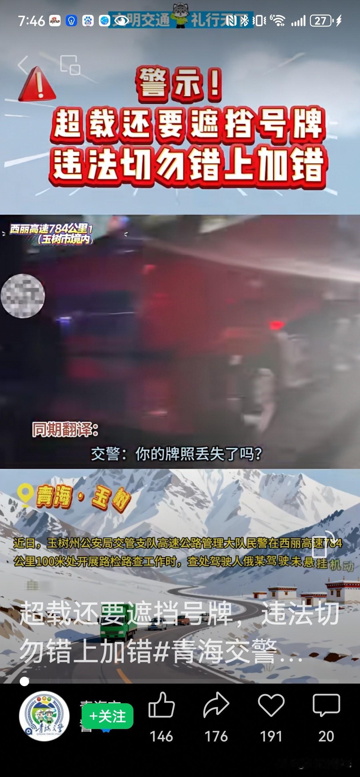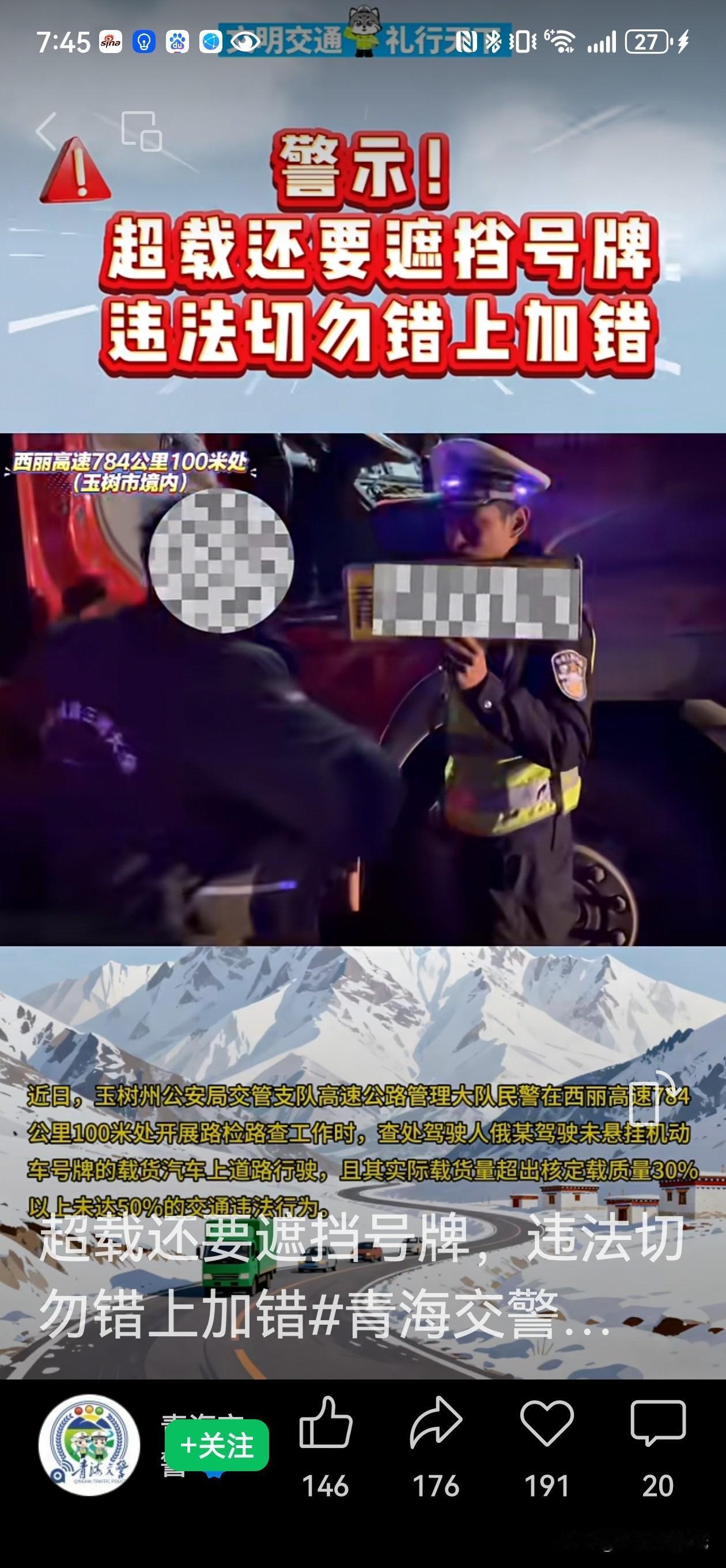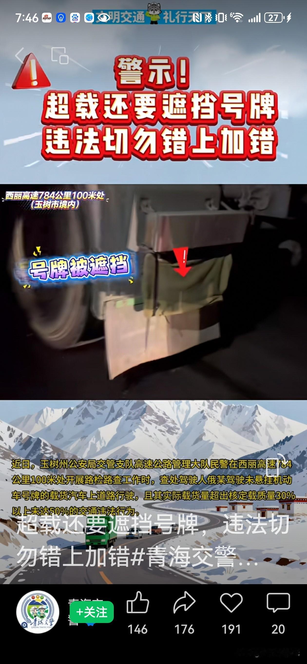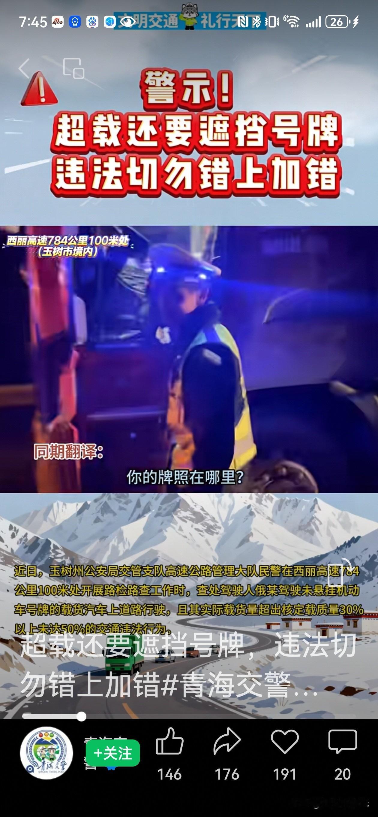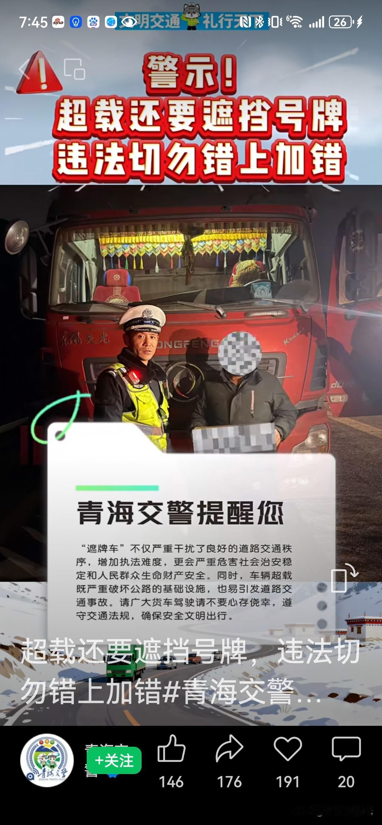 青海这俩司机你说他笨吧知道用毛巾遮挡车牌,你说他聪明吧干脆不挂车牌,现在满大街的摄像头电子眼,这不是直接告诉警察我违章了吗? 想用一块毛巾就让电子眼“失明”?以为不挂车牌就能在路上“隐身”?近日,青海两名驾驶人的“神操作”,堪称现实版“掩耳盗铃”,最终结果只能是“聪明反被聪明误”。 12月17日,乐都区交警发现一辆白色轿车的车牌被毛巾故意遮挡。驾驶人张某承认,此举是为了躲避电子眼抓拍。他的“小聪明”换来了罚款200元、驾驶证记9分的处罚。 12月3日,在玉树西丽高速公路上,交警查获驾驶人俄某驾驶未悬挂号牌的货车上路,且超载20%以上。因“未悬挂机动车号牌”和“超载”两项严重违法,俄某被合并处以罚款1000元、驾驶证记12分的重罚。 根据规定,驾驶故意遮挡或未悬挂号牌的机动车,一次记9分。而青海正持续开展超限超载专项整治,对“百吨王”、遮挡号牌、闯卡绕行等行为进行重点打击。货车超载不仅严重威胁交通安全,涉事车辆、驾驶人、运输企业及货源单位都将面临“一超四罚”。 交警提醒,号牌是车辆的“身份证”,任何企图污损、遮挡、不悬挂的行为都严重危害公共安全。请广大驾驶人勿耍“小聪明”,守法出行才是真正的“大智慧”。 无牌照扣几分