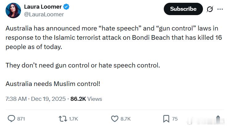 劳拉·卢默:澳大利亚已宣布推出更多“仇恨言论”和“枪支管制”法律,以回应邦迪海滩伊斯兰恐布袭击事件,该事件截至今天已造成16人死亡。他们不需要枪支管制或仇恨言论管制。澳大利亚需要的是穆斯林管制!