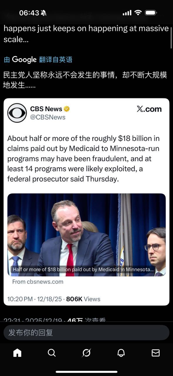 CBS新闻:一名联邦检察官周四表示,医疗补助计划向明尼苏达州运营的项目支付的约180亿美元赔偿金中,大约一半或更多可能涉及欺诈行为,且至少有14个项目可能受到了利用。