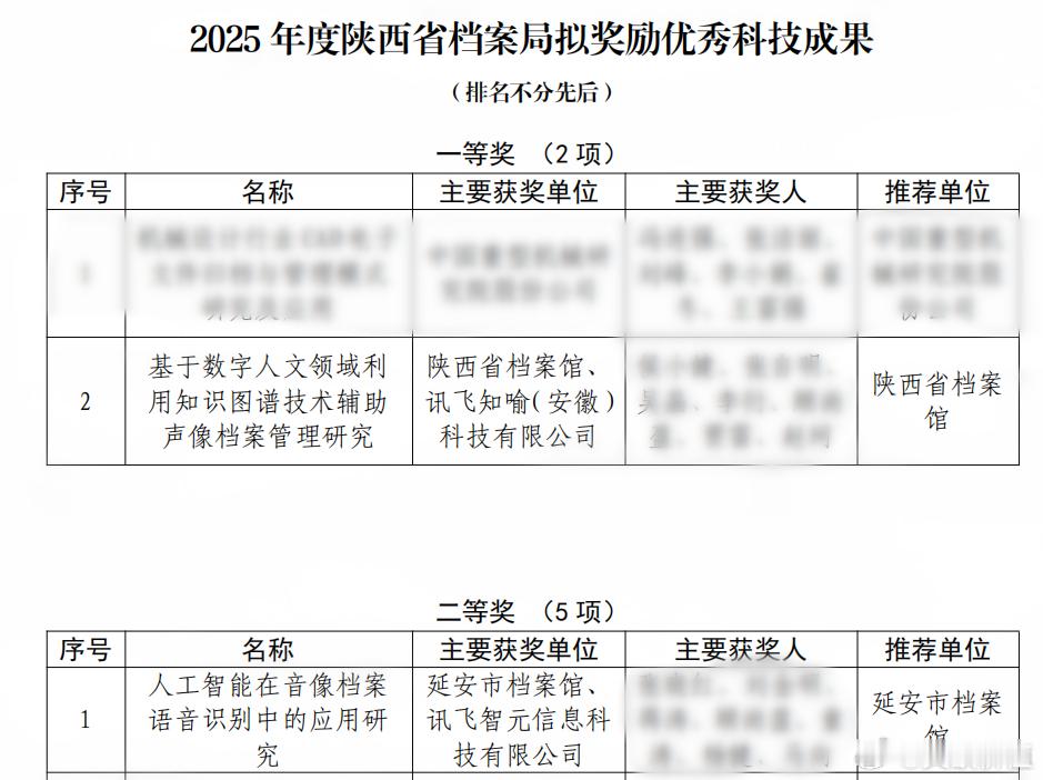 近日,陕西省档案局正式公示2025年度陕西省优秀科技成果评审结果,由陕西省档案馆与讯飞知喻联合完成的《基于数字人文领域利用知识图谱技术辅助声像档案管理研究》项目荣获一等奖,延安市档案馆与讯飞知喻共同推进的《人工智能在音像档案语音识别中的应用研究》项目获评二等奖。两项成果以创新性技术融合与行业应用价值,为全国档案数字化转型升级提供了“陕西样本”。🌹
