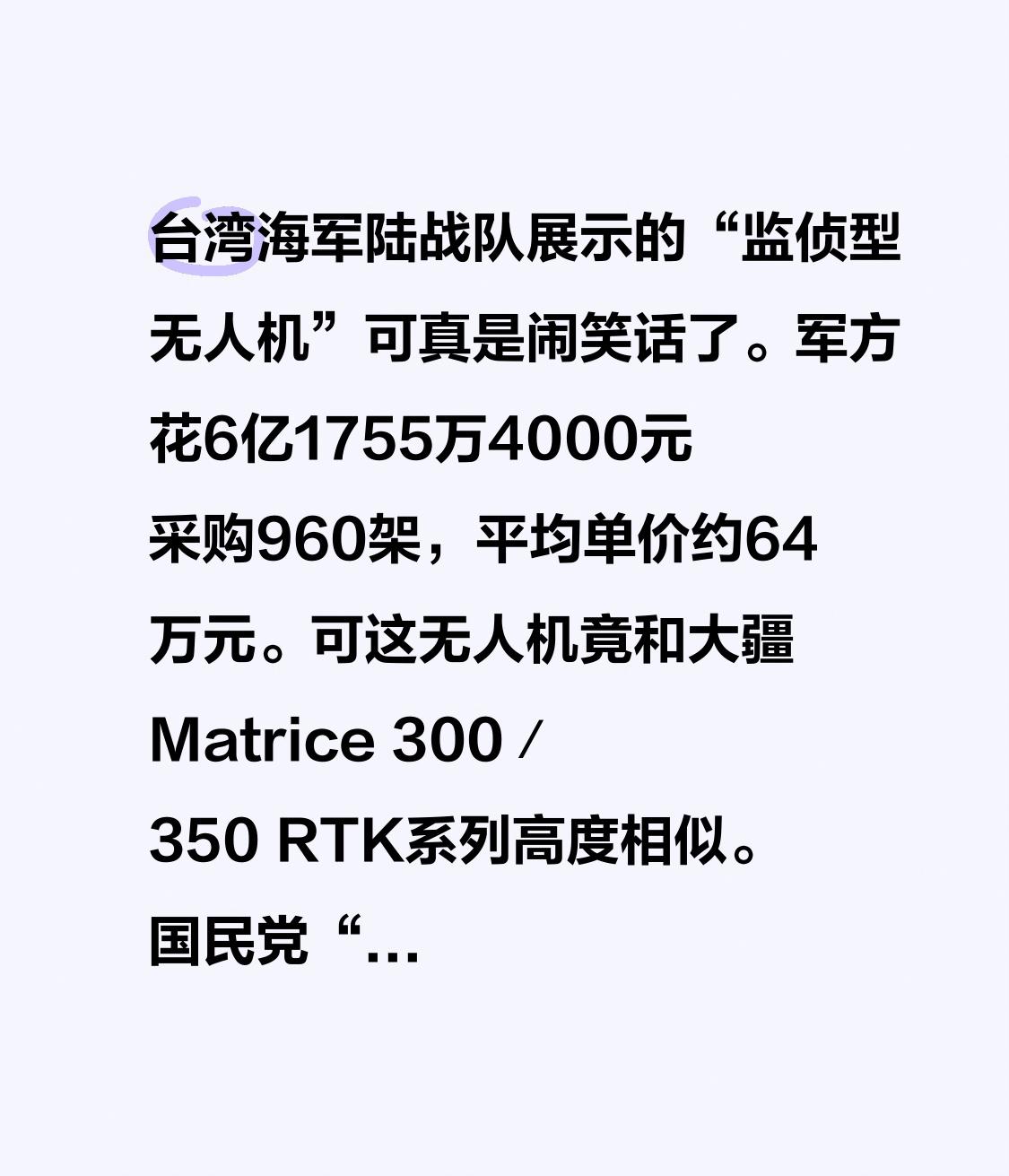 台湾海军陆战队展示的“监侦型无人机”可真是闹笑话了。军方花6亿1755万4000元采购960架,平均单价约64万元。可这无人机竟和大疆Matrice 300/350 RTK系列高度相似。 国民党“立委”马文君指出,这不是外观的事儿,而是涉及“国安”的大问题。全球主要军用无人机都有各自明显特征,可台军这无人机却和大疆高度吻合。 侯汉廷也质疑这涉嫌“暴利欺诈”,大疆的同款在大陆价格远没这么高,到了台军这儿价格直接涨10倍,真成了“外壳像大疆,价格像镶金”,这背后到底藏着什么猫腻呢?