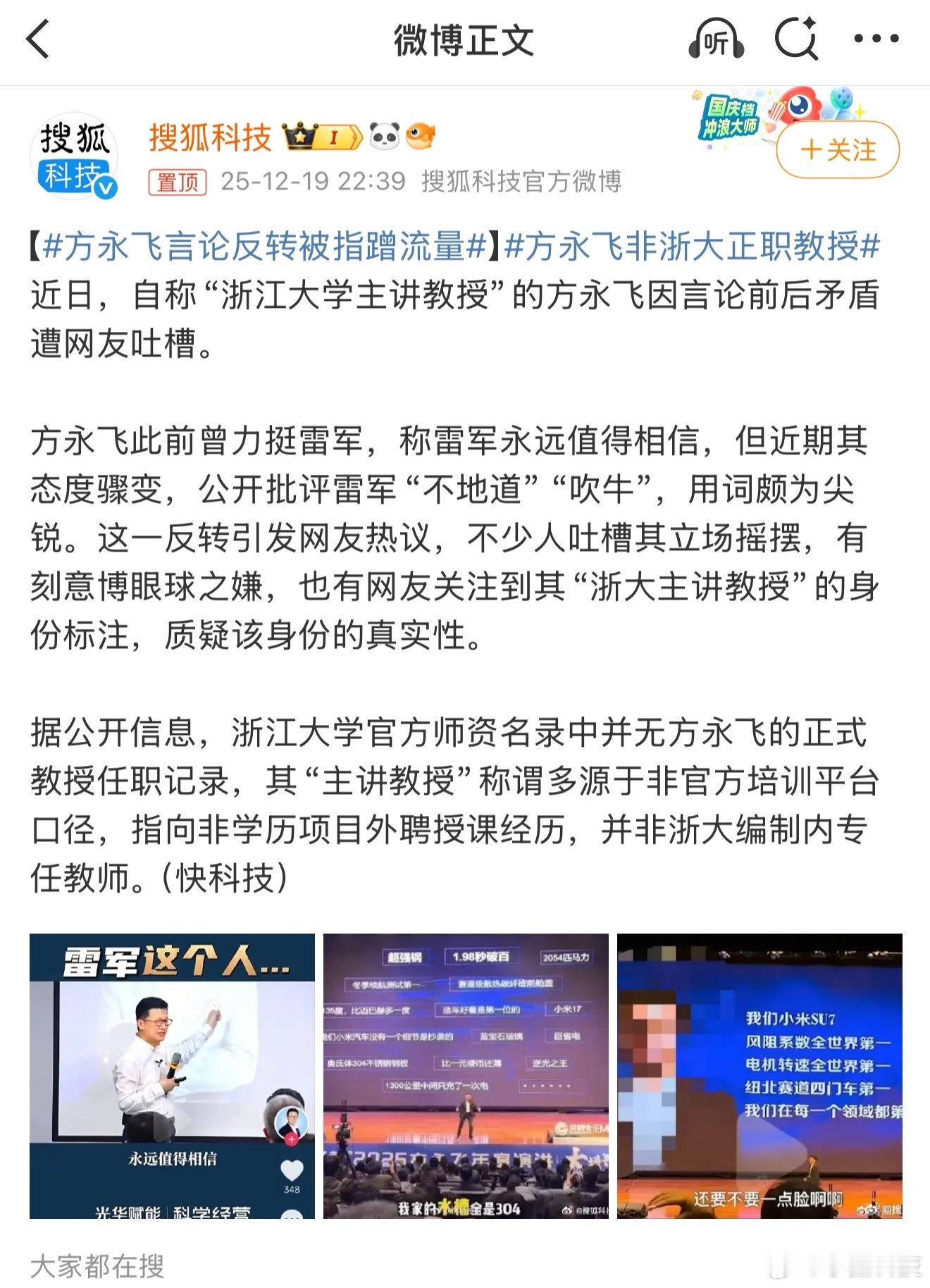方永飞言论反转被指蹭流量是不是真教授这事先不说真的假的,但流量真是一把双刃剑。靠着虚假或其它方式来获取的流量,或许一开始能吸引大家的关注。但谎言总有被揭穿的那一天,当大家看清事实的时候,连一声招呼都不打就会抛弃你。再一个为了维持一个谎言,不得不撒更多的谎,每天生活在焦虑中,生活过的并不轻松。现在网上很多人都是这样,用一些夸张的噱头甚至捏造一些事来博取关注,真的非常不可取。话说回来,一个连真实身份都存疑的人,他的话又有多少可信度呢?而且还是这种前边夸的不行,后边又去骂人的情况,就更不可信了。还是那句话网络不是非法之地,每个人都要为自己的行为负责,说话或发表看法更应该有事实依据。希望某些人在蹭流量之前,先考虑清楚。同时,大家也不要被误导了。方永飞非浙大正职教授