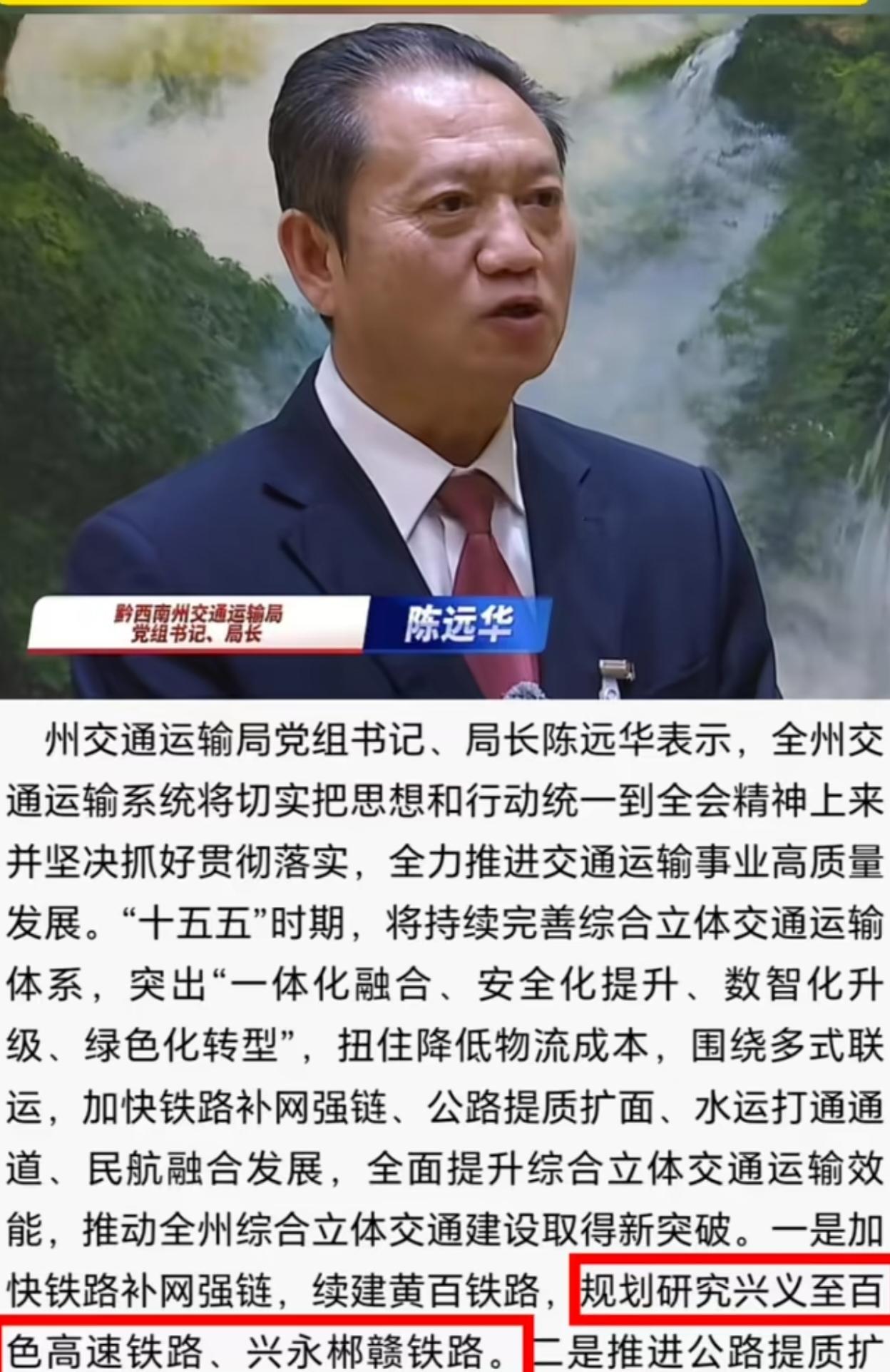 黔西南州“十五五”交通规划来了!两条新高铁提上日程! 未来几年,黔西南州将重点推进铁路“补网强链”,除了续建黄百铁路,更值得关注的是兴义至百色高速铁路和兴永郴赣铁路已进入规划研究阶段!这意味着黔西南与广西、湖南、江西的快速铁路通道有望打通。那么,这两条铁路有经过你的家乡吗兴义至百色高铁贵州十五五规划 黔西南