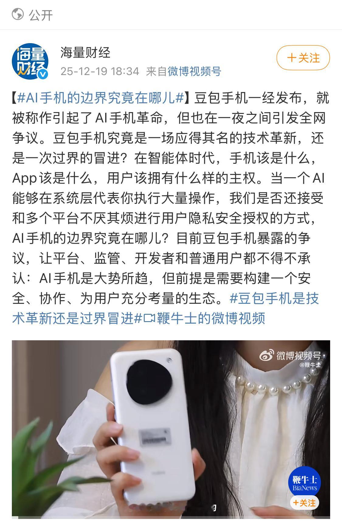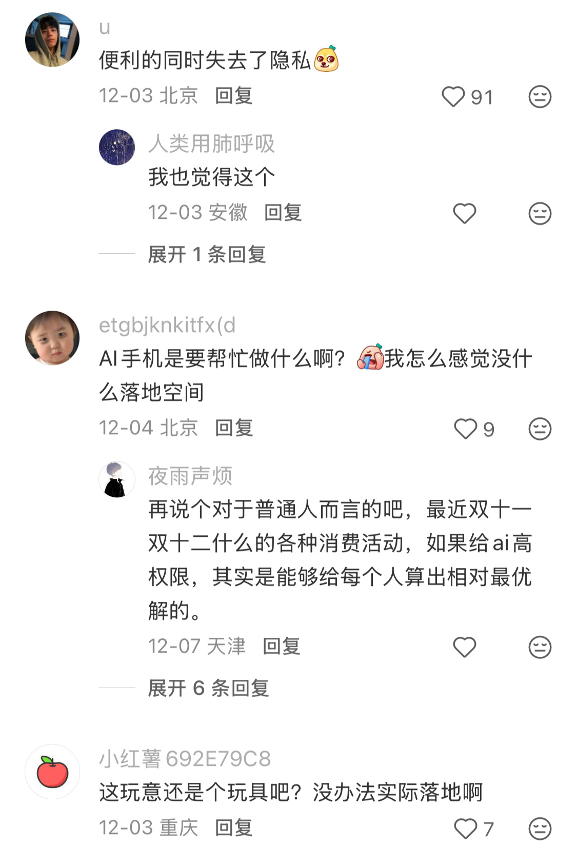 现代社会,手机对每个人来说,有多重要,不言而喻。衣食住行,各种数据都在里头,而AI手机对于手机行业,又是革命性的产品,感觉也是未来趋势。因为太方便,很多网友都表示,期待AI手机普及的那一天,能尽快到来。但也有部分人对AI手机持怀疑态度。因为手机承载着用户最私密的数据,包括通讯、位置、照片、健康信息等,AI手机真能做到不越界吗?一旦有争议的地方,你说是AI操作的,估计也很难能说的清楚。最后承担后果的大概率还是用户自己。或者说AI手机真正的边界在于“端侧智能”能走多远——即多少AI任务能在不泄露隐私的前提下,在本地设备上完成。AI手机的边界究竟在哪儿?只能说,每一个革命性的产品都有一段很长的路要走。AI不也发展了三年,才有今天这点光景。