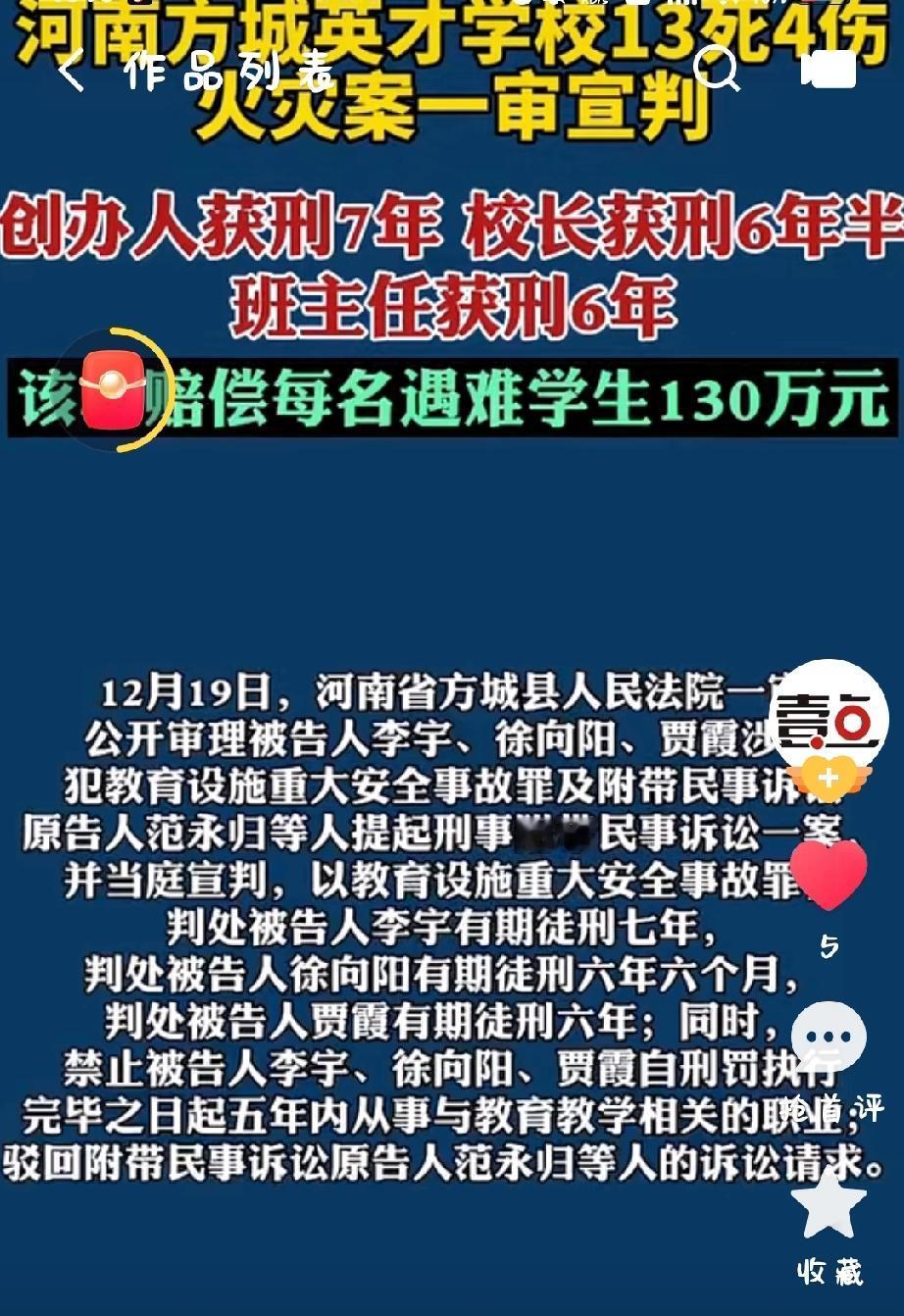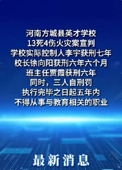 官方公布河南方城英才学校13死4伤火灾案宣判结果:赔偿每名遇难学生130万,校长获刑6年半 2025年12月19日,河南省方城县人民法院的一审宣判,为备受社会关注的英才学校"1·19"重大火灾案画上阶段性句号。学校实际控制人李宇、校长徐向阳、班主任兼宿管员贾霞因犯教育设施重大安全事故罪,分别获刑七年、六年六个月和六年,且被禁止五年内从事教育相关职业。 案件发生于2024年1月19日22时45分,方城县独树镇砚山铺村英才学校305男生宿舍突发火灾。这间83.2平方米的宿舍内竟然挤住着33名学生和1名宿管员,起火原因是一名8岁学生用打火机烧被子线头时,引燃了相邻床铺的衣物。由于宿舍内被褥、衣物等可燃物密集,木质床铺紧密摆放,火势在12分30秒内便发生轰燃,高温有毒烟气迅速充斥整个房间。 更令人痛心的是,火灾发生后屋顶消防水箱和室内消火栓无水,感烟火灾探测报警器没电,东侧安全出口被床铺堵挡,防盗网逃生口用铁丝缠绕。宿管员未及时有效组织疏散,火灾发生15分钟后才有人报警,最终13名学生因吸入有毒烟气遇难,4名学生也受伤了。调查还发现,该校长期违规办学,未取得完整登记证书,安全管理制度形同虚设。 事发后,学校与遇难学生家属达成赔偿协议,每名家属获赔130万元,但金钱无法挽回逝去的生命。除涉案3人获刑外,25名履职不力的公职人员也受到党纪政务处分,彰显了"失职必追责"的决心。 这起悲剧带来的感悟沉重而深刻。一个学校首先就要把孩子们的安全放在首位,而英才学校的管理者们都将安全责任抛诸脑后,用孩子们的生命换取利益,最终难逃法律制裁。一个宿舍,住了34个人,消防栓没有水,安全出口又被堵,校园安全无小事,消防设施的每一个漏洞、管理流程的每一处疏忽,都可能成为吞噬生命的黑洞。