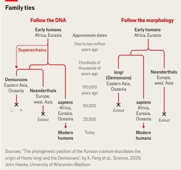 丹尼索瓦人究竟是谁?关于现代人类神秘“表亲”的起源,科学界正展开激烈辩论经济学人网站刊发的文章报道说,丹尼索瓦人是与尼安德特人和智人同时存在的古人类族群,尽管科学家早已在基因中发现其痕迹,但对其外貌和起源仍知之甚少。2021年中国科学家展示的“哈尔滨头骨”被认为属于丹尼索瓦人,为这一神秘族群提供了第一张“面孔”。然而,头骨的外形特征与现有基因数据存在矛盾,可能暗示现代人类的祖先并非起源于非洲,这一观点挑战了人类演化的传统认知。1933年日本入侵中国东北期间,一名男子受雇在哈尔滨附近的松花江上建桥。在挖掘过程中,他发现一具埋在河岸泥中的巨大古人类头骨。他将其藏入一口井中,直到临终才将这一秘密告诉孙辈。这便是几年前骨被捐赠给中国河北地质大学博物馆时所附的故事,真伪虽难考证,却成为来源传说的一部分。如今,这块头骨的真实出处仍存在争议,但层次已远超个人或地区范畴。最新的DNA证据表明,这块头骨属于一个神秘的人类群体:丹尼索瓦人。科学界对丹尼索瓦人知之甚少,这块头骨本应有助于揭示他们的身份及其在人类演化中的角色,然而外形却与基因数据相矛盾,反而加深了谜团,其中所暗示的演化史,可能意味着智人的祖先起源于非洲以外,这一观点颠覆了古人类学界长久以来对人类起源的共识。在人类演化史上,现代人类(智人)曾与另一种人类物种——尼安德特人共存。尼安德特人身材矮壮,能制造复杂工具,会埋葬死者,甚至有艺术表现。2008年,科学家在西伯利亚丹尼索瓦洞发现了一块距今约3万至6万年的儿童指骨。德国马克斯·普朗克研究所的斯万特·帕博团队从中提取DNA后发现,这并非尼安德特人,也非智人。研究团队由此宣布发现了一个新人类群体:丹尼索瓦人。随后,遗传学研究在现代人类,特别是亚洲人中,发现了丹尼索瓦人DNA的痕迹,正如今日全球各地人群体内普遍存在尼安德特人DNA一样。为海外华人提供有价值的信息与分析,更多内容和全文可在蓝天、电报、x查找causmoney,或直接谷歌搜索caus.com但丹尼索瓦人究竟是什么样的人?目前仅发现了12块他们的骨骼碎片,远不足以拼凑出一张完整面孔。2021年,中国科学院古人类学家倪喜军领导的团队向世人展示了这块哈尔滨头骨,距今超过14.6万年,脑容量巨大,类似智人,但眉脊隆起等特征又不符合现代人外貌。这个团队提出了一个新物种:龙人。2025年,这块头骨被确认属于丹尼索瓦人。今年6月和7月发表的两篇论文中,中国科学院分子遗传学家付巧妹分别宣布,在哈尔滨头骨牙齿上的牙垢中发现了古老蛋白和线粒体DNA,显示为丹尼索瓦人。这一成果令全球科学界兴奋:丹尼索瓦人终于有了“面孔”。这项成果也为中国本土古人类化石研究赢得了学术地位。过去一个世纪中,中国发现了大量古人类化石,但长期以来被西方学界视为缺乏演化意义,认为这些化石主要属于直立人——一种约200万年前起源于非洲的古人类,在约11万年前灭绝于东南亚。而许多中国研究者则认为,中国的直立人化石是现代中国人的祖先,尽管大量证据表明现代人类主要起源于非洲。夏威夷大学马诺阿分校古人类学家克里斯托弗·贝指出,直到近二十年,世界才开始用新视角看待这些中国化石。龙人只是近年来基于中国头骨提出的众多新物种之一。事实上,克里斯托弗·贝与中国科学院的吴秀杰,在2024年曾将一些头骨归类为新物种“巨颅人”(Homo juluensis),并认为丹尼索瓦人属于这个物种。与此同时,中国本土的古DNA和蛋白质研究也取得进展。例如,付巧妹从哈尔滨头骨牙垢中成功提取出微量DNA,表明即使在潮湿或年代久远的地区,也有可能获取可用遗传信息。这类研究可能推动更多此前被视为保存条件差的中国化石进入分子科学研究的视野。然而,自付巧妹的研究发表以来,一个难题浮现。来自丹尼索瓦人骨骼提取的核基因组显示,丹尼索瓦人与尼安德特人来自同一祖先谱系,并早于智人与这两者分化。2025年10月20日帕博团队成员珍妮特·凯尔索,发布了最新丹尼索瓦人牙齿高质量基因组预印本,其中这一结论再次得到确认。但若看外形特征(形态学)——如牙齿、脑壳、前额和眉骨等,则讲述的是完全不同的故事。倪喜军与英国自然历史博物馆的克里斯·斯金纳认为,龙人与智人的祖先在尼安德特人与其分化之后才分家。这一基因与形态学的不一致引发了谜团。如果依据DNA,智人谱系是在约50万至80万年前从一个被称为“尼安索瓦人”(Neandersovans)的祖先群体中分化出来的。这个群体从非洲扩散至欧亚大陆,尼安德特人的祖先最终向西迁至欧洲,丹尼索瓦人的祖先则向东进入亚洲。根据凯尔索的新基因组研究,至少有三个不同的丹尼索瓦人群体,与约6万年前从非洲迁出的智人发生过基因交流。将这三类丹尼索瓦人与现代人群进行比较,显示不同时间和路径进入亚洲的智人群体与不同的丹尼索瓦人群体发生了接触。现代大洋洲人,包括澳大利亚原住民的祖先,是最早一批;东亚和南亚人群的祖先则是在更晚时期进入。但如果按照形态学的解释,智人和龙人的祖先(包括丹尼索瓦人)最初是同一群体,可能早在一百多万年前就生活在欧洲或西亚。倪喜军和斯金纳的分析依据除了哈尔滨头骨,还包括他们在《科学》杂志2025年9月发表的研究——对一具距今百万年、在中国发现的“郧县