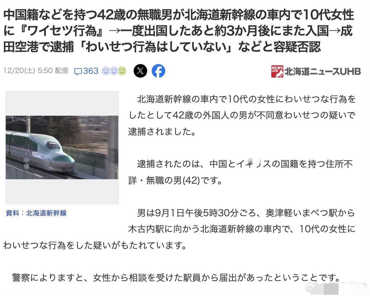 一个42岁中国籍男子在日本新干线上猥亵一名十几岁少女被抓,经过调查他还同时拥有英国护照,也就是说他是双重国籍,这种本事不一般,却是个无业到处闲逛的街溜子。能同时搞到两种护照的显然不是普通人,这种的好处自然是多多,懂的都懂。妇女猥亵