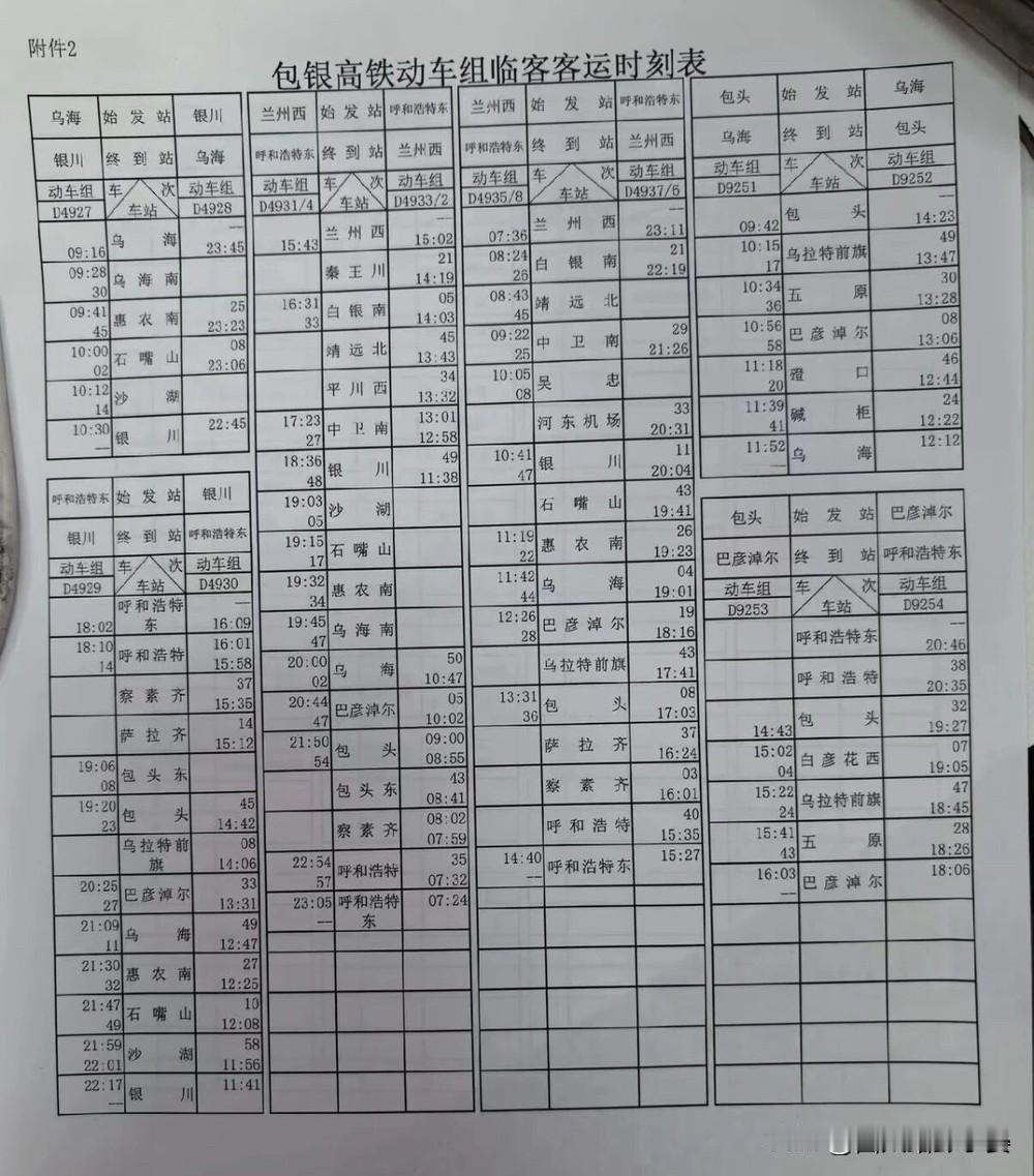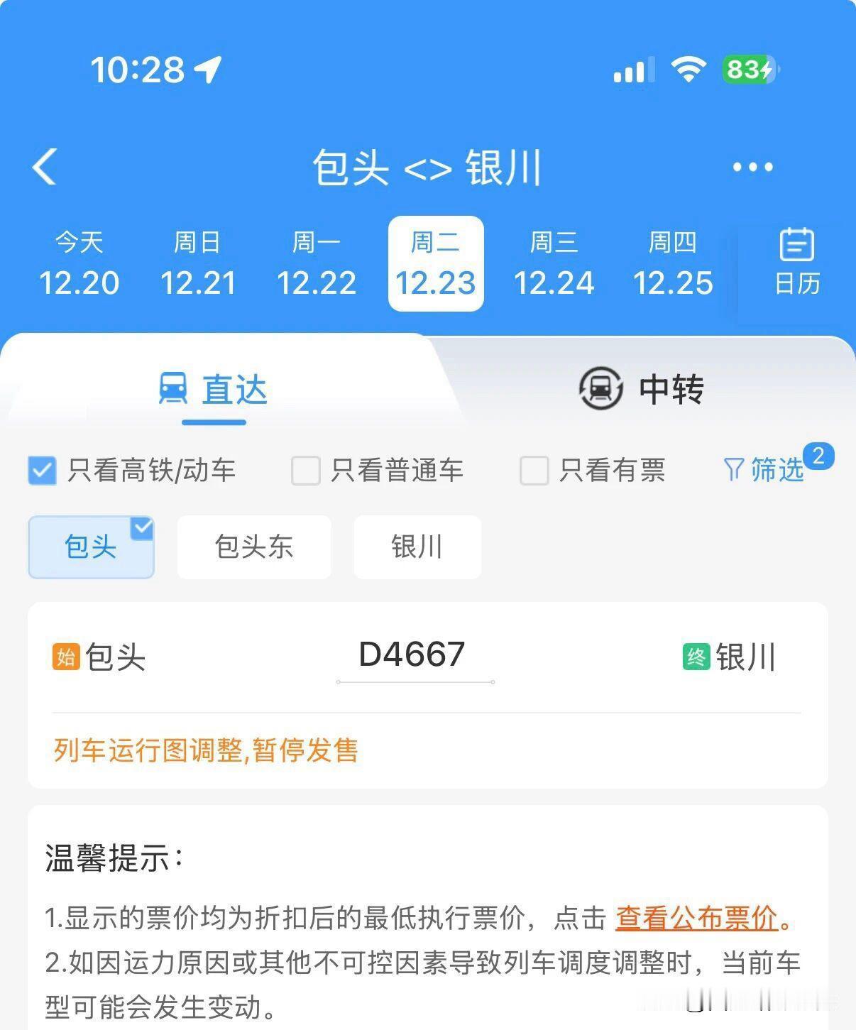定了!包银高铁12月23日全线贯通,12306首发车次已上线,预计复兴号领衔开跑 12月23日,包银高铁包头至惠农段将正式通车,标志着全长519公里的包银高铁实现全线贯通运营。这条串联内蒙古与宁夏的"八纵八横"京兰通道关键段,不仅让巴彦淖尔、乌海迈入高铁时代,更将为西部大开发注入新动能。 目前铁路12306APP已录入首发车次信息:23日包头至银川的D4667次列车将作为首发车次,推测为单日往返的纪念车次,24日后暂无该班次安排。结合联调联试时曾用CR400BF-J型复兴号检测车测试的背景,首发大概率采用复兴号动车组,仪式感拉满。不过当前车次尚未录全,银川至包头返程车次及票价暂未显示。 开通运营初期,包银高铁包惠段按最高时速按250公里运营,每日最多开行12列动车组,其中7列为跨线车。24日起将常态化开行呼和浩特至银川D4929次、呼和浩特至兰州西D4933/37次等车次,覆盖跨区域及巴彦淖尔、乌海等管内站点。 时效提升尤为显著:包头至惠农南、银川最快分别2小时7分、2小时38分可达,较目前普速旅客列车分别压缩2小时29分、3小时20分。呼和浩特至银川、兰州最快分别4小时03分、7小时27分可达,较目前最快旅客列车分别压缩3小时54分钟、2小时59分钟。 这条"草原到塞上江南"的高铁线藏着满满的旅行惊喜:从包头的北方兵器城、黄河凌景,到巴彦淖尔的乌梁素海冬捕、黄柿子火锅,再到乌海的"一半沙漠一半湖"奇景,最后抵达银川的西夏王陵与酒庄,一路串联多元风光。 更大规模运力将在2026年1月26日调图后释放,预计新增更多跨线车次。随着这条首条连接两个少数民族自治区的高铁贯通,西北高铁路网进一步完善,沿线出行与经济联动都将按下"快进键"。