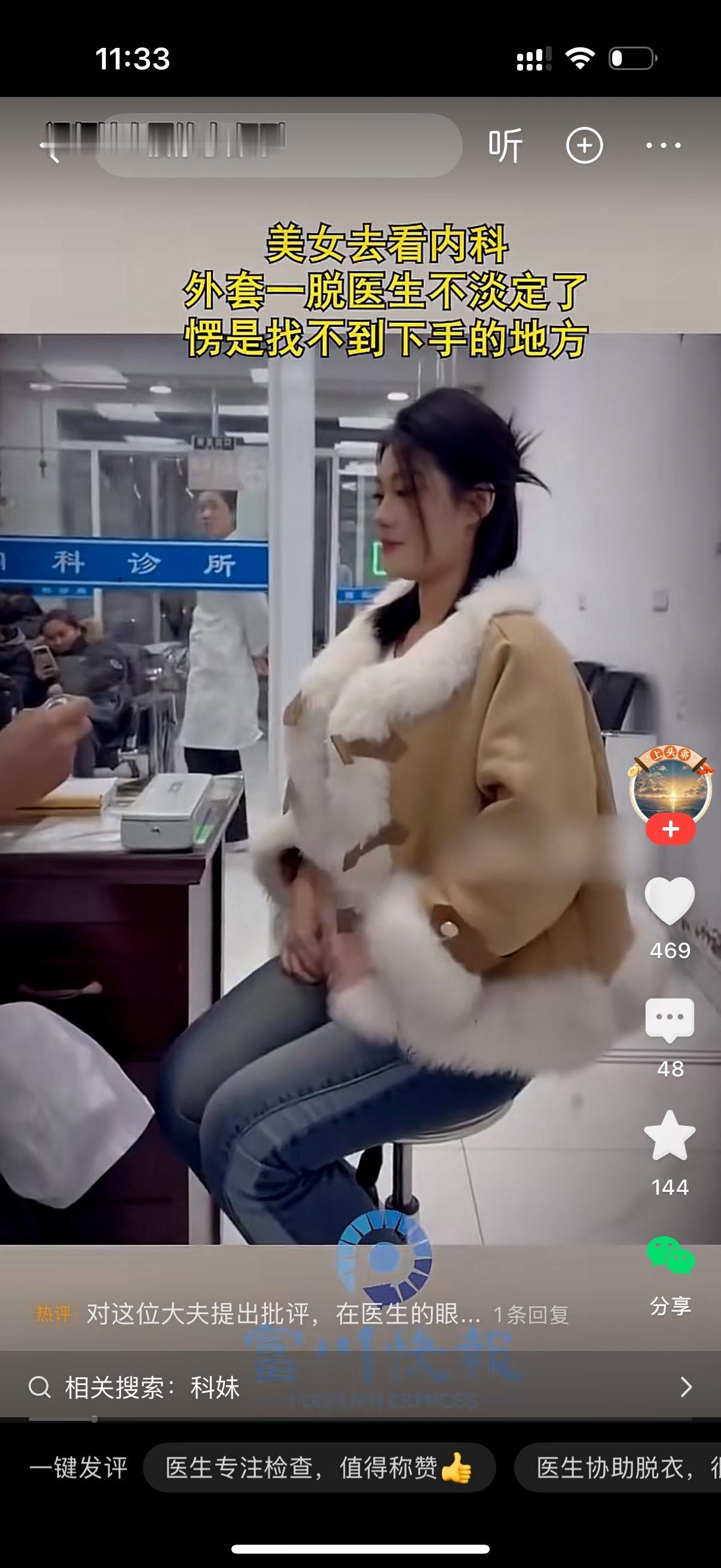 美女去看内科,医生让她脱掉外套做检查。美女端坐下来,脱掉外套,医生瞬间不淡定了。叱咤职场多年的医生见过大的,从没见过这么大的,关键是他的眼睛不太敢直视,听诊器也不知道往哪里搁,这也不是,那也不是。美女都被整得不好意思,一脸尴尬的笑。医生也是有点羞愧难当,所以太大也不是啥好事。