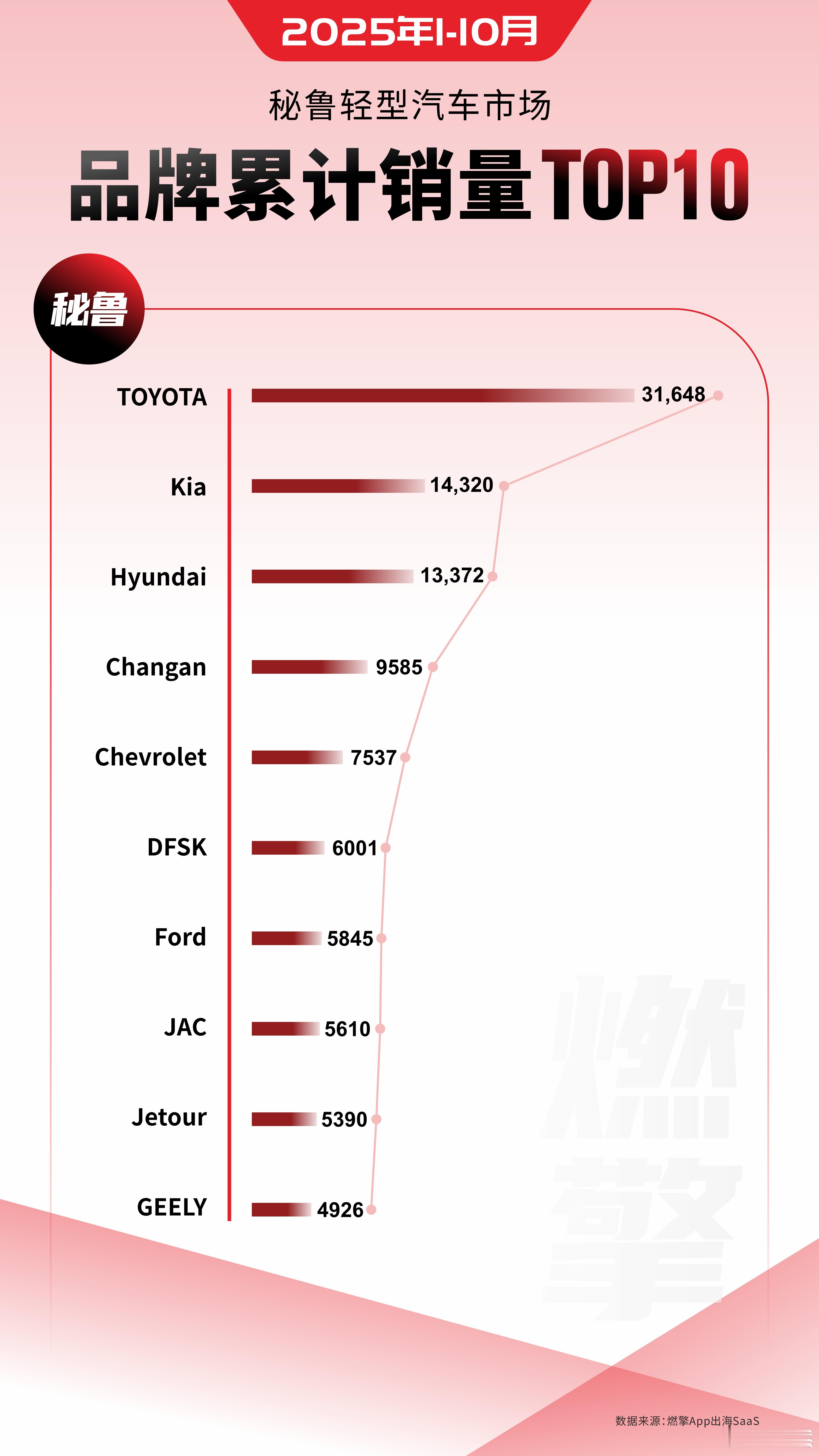 1-10月秘鲁轻型汽车市场:中国品牌,长安领跑2025年1-10月,秘鲁轻型汽车市场品牌累计销量前十的格局呈现出清晰的竞争层次。丰田凭借强大的综合优势保持领先,起亚和现代构成稳固的第二梯队,而中国品牌则通过多品牌策略实现了广泛的市场渗透。丰田以31648辆的累计销量占据显著领先地位,其销量规模达到第二名起亚的两倍以上。这一成功主要源于其产品线与秘鲁市场需求的高度契合:混动车型与经济型SUV及轿车,既能满足城市用户对燃油经济性的要求,也能适应乡村地区的轻度复杂路况,配合长期建立的质量口碑,巩固了其市场主导地位。韩系品牌起亚和现代分别以14320辆和13372辆的销量位居第二和第三。它们主要凭借在设计、配置与价格之间取得平衡的中端家用SUV和紧凑型轿车,服务于秘鲁中等收入家庭市场,形成了稳定的市场份额。中国品牌在本期榜单中表现突出,共有五个品牌进入前十,占据半壁江山。长安以9585辆的销量位列第四,成为中国品牌中的领跑者。DFSK、JAC、捷途和吉利等品牌也凭借高性价比的SUV及经济型轿车成功上榜。这些产品精准对应了秘鲁市场对城市通勤兼顾轻度越野的复合需求,并通过差异化定位覆盖了从商用、入门家用到中端家用等多个细分场景,整体市场渗透效果显著。总体而言,丰田在秘鲁市场的领先地位在短期内预计仍将保持。同时,中国品牌通过多品牌、多品类的协同布局,已建立起可观的市场份额,成为不可忽视的力量。韩系品牌则继续在中端家庭用户市场中扮演着重要角色。大v聊车