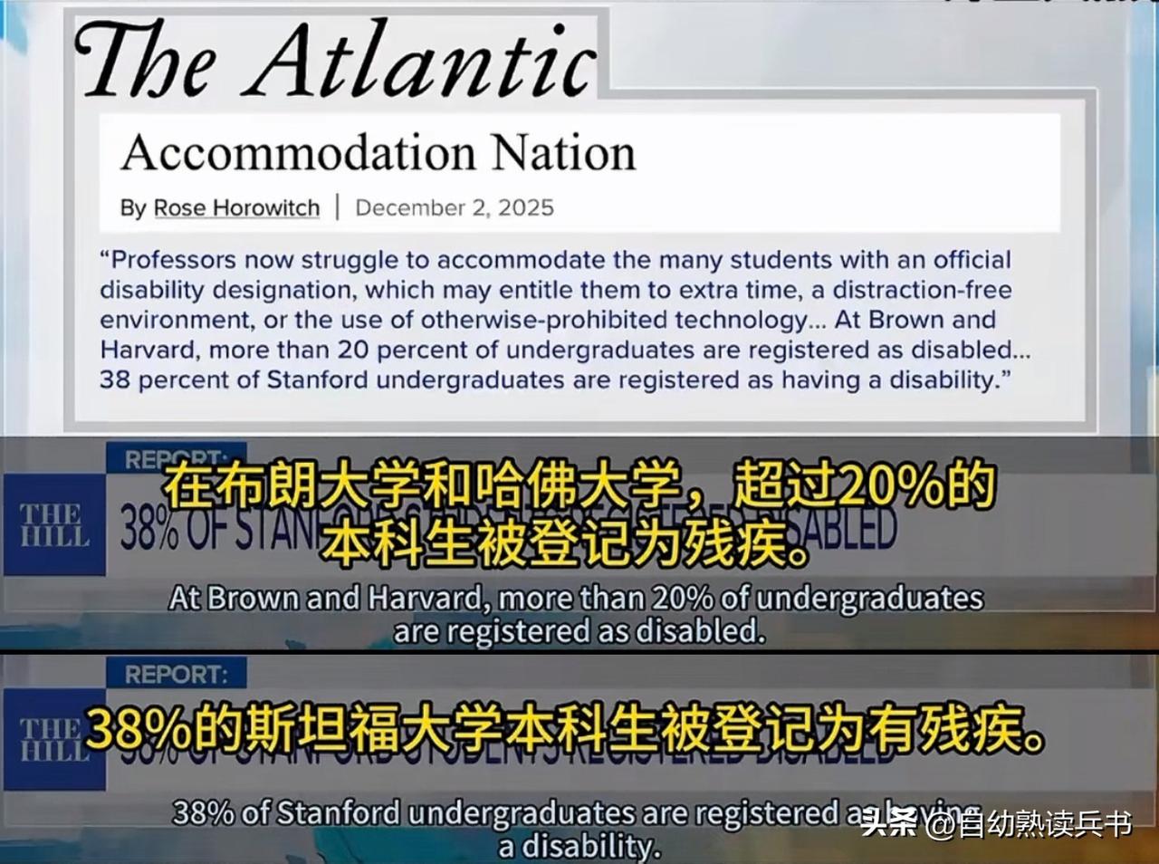 就离谱,美国常青藤大学“残疾人”占比高达38%,美国富人把卡BUG玩到了极致。要说美国富人才是玩弄文字的高手,富人们通过游说,直接把认知障碍,多动症等小毛病纳入残疾范畴。为的就是可以在大学下最小的功夫获得毕业证。因为你只要获得这个残疾人证,就可以获得很多优势,比如延长考试时间,甚至老师也会网开一面。 这么好的bug,当然是花费不菲。目前就这个证件的市场在美国已经形成了120亿美金的规模,而且还在持续增长。目前,一次全面心理评估费用1万美金,但这只是门槛费用,如果想要获得自己需要的那种精神疾病,那没得说,还得多加钱。而且鉴定结果也不是一锤子买卖。今年病了今年鉴定,明年病不病的,就看你懂不懂事了。 而这也几乎成为了富人的特权,因为普通穷人根本没有办法承担这笔开销。 短期来看,富家子弟是一点苦都不吃,也确实更容易毕业,但从长远来看,大学阶段你都不愿意学习,那到了社会上诸多事物缠身,你更不愿意学习了。 最终,恐怕就会像欧洲政客一样,成为一群不学无术,无能之辈。
