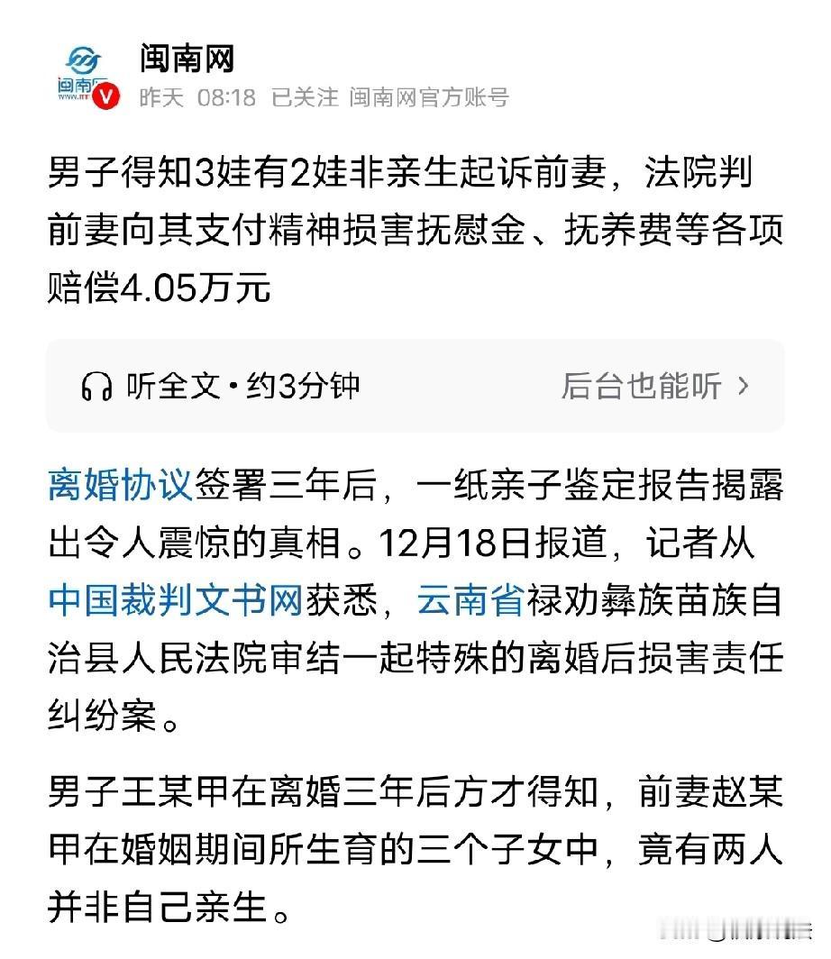 云南,男子的妻子怀了第3胎,他一算日子不对,怀疑不是自己的,两人因此离了婚,离婚3年后,男子为了解开心结,带着大儿子、二儿子去做了亲子鉴定,却发现3个孩子有2个不是亲生,只有婚前生的大儿子是他亲生骨肉,男子非常气愤,前妻在离婚时故意瞒着二儿子不是亲生,让他在不知情的情况下同意了财产和子女抚养分割条件,一怒之下告上法院,法院判决令人感叹! 2017年,王先生和赵女士登记结婚了,其实,两人在婚前已经生有大儿子了,一家三口倒也温馨幸福。 婚后第二年,也就是2018年,两人的第二个儿子出生了,生活看似平静,然而,到了2022年,这份平静彻底被打破。 这一年,赵女士又怀孕了,按理说王先生又要做爸爸了应该高兴,可是他怎么也高兴不起来。 妻子怀孕后,王先生就推算了一下时间,根本对不上,他越想越不对劲,怀疑这孩子不是自己的。 王先生心里有了疑虑后,因为这事和妻子的感情也出现了问题,两人三天一小吵几天一大吵,原本脆弱的夫妻感情摇摇欲坠。 到了年底,王先生和赵女士对这段婚姻心灰意冷,觉得日子实在过不下去了,两人协议离了婚。 离婚协议约定:赵女士自愿放弃全部夫妻共同财产,由她抚养二儿子,而王先生抚养大儿子,并且,双方互不支付抚养费。 这场婚姻在外人看来已经彻底画上句号,可谁也没想到,背后还隐藏着巨大的秘密,一旦揭开,都很难堪。 自从离婚后,王先生的心里一直有个心结,孩子到底是不是自己的就像一根刺,扰的他坐立难安,一想到这事他的心情就无比的烦躁。 犹豫了三年后,在2025年8月,王先生再也忍不住了,想要知道真相,便带着大儿子、二儿子去做了亲子鉴定。 等待结果的那几天,王先生的心情忐忑不安,七上八下。 当鉴定结果出来后,本做好心里准备的王先生还是深受打击,他的二儿子根本就不是他亲生的! 好在大儿子是他亲生的。 更让他崩溃的是,那个2022年出生、导致他们离婚的第三个孩子也不是他的。 也就是说,赵女士在婚姻存续期间生的两个孩子都不是王先生的,只有那个婚前生的大儿子才是他的亲生骨肉。 这个结果一出来,这些年所有的委屈和屈辱都冲击着王先生,让他崩溃不已。 而且,王先生还忍不了一点,就是前妻赵女士在离婚时竟然刻意瞒着他二儿子不是亲生,导致他在不知情的情况下,稀里糊涂同意了离婚协议里关于财产分割、子女抚养的所有条件。 王先生觉得自己被赵女士背叛,权益也受到了严重的侵害,愤怒和痛苦交织在一起让他无法忍受。 于是,在2025年11月,王先生将前妻赵女士告上了法院。 那么,时隔三年后,王先生还能争取回属于自己的一切吗? 在此事件中,赵女士在离婚时故意隐瞒次子非王先生亲生这一关键事实。 导致王先生在不知情的情况下,同意了离婚协议中的财产分割和子女抚养安排。 这相当于赵女士通过欺骗手段,让王先生做出了并非真实意愿的决定,符合欺诈的特征。 《民法典》第148条规定:一方以欺诈手段,使对方在违背真实意思的情况下实施的民事法律行为,受欺诈方有权请求人民法院或者仲裁机构予以撤销。 王先生可以依据相关法律规定,请求法院撤销该离婚协议中涉及欺诈部分的内容,重新对财产和子女抚养等问题进行公正处理,以维护自己的合法权益。 另外,赵女士婚姻存续期间生的两个孩子都不是王先生亲生,严重违背了夫妻之间的忠实义务,给王先生带来了极大的精神痛苦和伤害。 《民法典》第1091条规定:有下列情形之一,导致离婚的,无过错方有权请求损害赔偿:(一)重婚;(二)与他人同居;(三)实施家庭暴力;(四)虐待、遗弃家庭成员;(五)有其他重大过错。 这种伤害不仅仅是情感上的背叛,还涉及到对家庭信任体系的破坏以及对王先生人格尊严的践踏。 法院在判决精神损害抚慰金时,综合考虑了赵女士的过错程度、本地经济水平、其实际负担能力以及离婚时已放弃财产的情况等因素,判定赵女士赔偿王先生1.5 万元的精神损害抚慰金。 这个金额既对赵女士的过错行为给予了应有的惩戒,也在一定程度上对王先生所遭受的精神损害进行了补偿。 最后,王先生与二儿子之间不存在亲子关系,也就没有法律上的抚养义务。 然而,王先生在不知情的情况下,已经为二儿子支付了抚养费,这部分费用赵女士应当予以返还。 法院按照当地生活标准,每月 500 元计算抚养费,共计算 51 个月(从出生到鉴定时大致时间),判决赵女士返还 2.55 万元。 最终,法院判决:赵女士需向王先生支付各项赔偿共计4.05万元。 忠诚是婚姻的底线,一旦逾越,一定会付出沉重代价,同时也提醒大家在面对婚姻变故时,要运用法律武器,勇敢的维护自身合法权益。