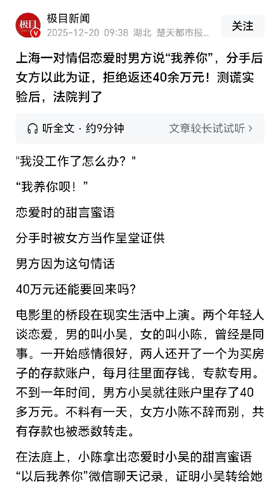 “把电影搬进了现实!”上海,男子和女同事互生好感,很快发展为情侣关系。同居期间,两人约定攒钱买房,男子每个月把收入转给女子的账户,还经常对女子说“以后我的钱都给你安排”“我养你”的甜言蜜语。不到一年时间他就转了将近40万,女子却只存入一小部分,男子觉得两人感情成熟,带女子见了父母,给她买了两万元的金手镯,父母也给了11200元的订婚金。万万没想到,此后没多久,女子带着他们买房的存款不辞而别,这段感情也宣告“破产”。男子气不过,把女子告上法庭要求退还这些钱,女子:你说过养我的,这些钱都用于日常开销了。法院仅用一招,就让真相浮出水面。 2023年10月,男子小吴和同事小陈互生爱意,正式确认了恋爱关系。 两人曾是朝夕相处的同事,共事半年多,默契早已悄悄滋生,一来二去间,那份好感便捅破了窗户纸,顺理成章地走到了一起。 当年年底,两人搬进了出租屋,开始了同居生活。 小吴是个踏实肯干的小伙子,满心满眼都是和小陈的未来,每天下班回家,看着屋里亮着的灯,他就忍不住畅想:等攒够了钱,他们也在上海买套属于自己的房子,再也不用颠沛流离了。 小陈依偎在他怀里,连连点头,眼里满是对未来美好生活的憧憬。 为了这个买房梦,两人特意用小陈的身份开了个账户,约定好专款专用,每月工资都往里存。 小吴格外上心,每个月发了工资,第一时间就把大部分钱转进去,少则一两万,多则好几万,不到一年,就足足存入了40多万。 偶尔小陈也会存一点,但数额远不及小吴。 闲暇时,两人还会窝在沙发上刷房产信息,小陈把看中的房源发给小吴,两人一起讨论户型、地段,日子过得有滋有味。 同居不久遇到公司裁员,小陈不幸被优化。丢了工作的她整日唉声叹气,情绪低落到了极点,她抱着小吴,委屈巴巴地问:我没工作了,以后可怎么办啊? 小吴心疼地安慰她,脱口而出:怕什么,以后我养你! 这句脱口而出的甜言蜜语,竟然被小陈悄悄存进了聊天记录里,成了日后的“证据”。 转眼到了国庆,小吴觉得两人感情成熟,到了谈婚论嫁的年纪,于是便带着小陈回了老家。 小吴父母见了准儿媳,笑得合不拢嘴,当场给了11200元的订婚金。小吴也大方地给小陈买了个两万多的金手镯,又花了三万块给小陈父母置办礼物。 可等他们去小陈老家时,气氛却冷了下来,小陈的父亲始终没有露面,两人只吃了两碗面条,就心事重重地回了上海。 小吴没多想,只当是长辈暂时不认可,想着以后慢慢磨合就好。 万万没想到,这竟是分手的前兆。 10月底,小陈的妈妈来上海暂住,没过几天,小吴就发现,那个存着57万购房款的账户,余额竟然清零了,钱全被小陈转给了她妈妈。 更让小吴心寒的是,没过多久,他手机里和小陈的聊天记录也被小陈偷偷删得一干二净。 又过了几天,小陈和她妈妈悄无声息地搬走了,只留下空荡荡的出租屋,和小吴破碎的梦。 愤怒又绝望的小吴,一纸诉状将小陈告上了法庭,要求返还32万余元购房款、房租、金手镯折价款和订婚金等。 法庭上,小陈却倒打一耙,拿出那句“我养你”的聊天记录,辩称这些钱都是小吴自愿给她的生活费,还拿出几十页消费账单,说钱早就花完了。 她甚至矢口否认订婚一事,声称金手镯已经归还。 小吴百口莫辩,好在他电脑里还存着部分聊天记录,里面清晰记录着两人讨论买房的点点滴滴。 家务事最难断,看着双方各执一词,案件陷入了僵局,法官提出要给双方测谎,小吴和小陈都一口同意。 测谎结果出来的那一刻,真相终于水落石出:小吴全部通过,小陈却一项都没通过,必将承担不利的法律后果。 《民法典》第六百六十一条规定:赠与可以附义务。赠与附义务的,受赠人应当按照约定履行义务。 本案中,小吴和小陈明确约定开立专用账户来存储购房款,小吴转账的40余万元是基于双方要共同买房的约定,也是以缔结婚姻为核心目的,这些都属于附义务的赠与。 而小陈在未告知小吴的情况下,私自转走全部购房款,还和母亲悄悄搬离出租屋,以实际行动表明不会和小吴履行缔结婚姻的义务,应当返还。 《最高人民法院关于审理涉彩礼纠纷案件适用法律若干问题的规定》第六条规定:双方未办理结婚登记但已共同生活,一方请求返还按照习俗给付的彩礼的,人民法院应当根据彩礼实际使用及嫁妆情况,综合考虑共同生活及孕育情况、双方过错等事实,结合当地习俗,确定是否返还以及返还的具体比例。 本案里小吴父母给付的11200元订婚金,以及小吴购买的价值2万余元金手镯,都属于彩礼范畴。 两人虽已同居但最终未办理结婚登记,且是小陈私自转款,存在明显过错,而且测谎结果也佐证其陈述不实。 最终,法院酌情判决小陈返还小吴30万元,同时承担小吴的6000元测谎费和大部分诉讼费。