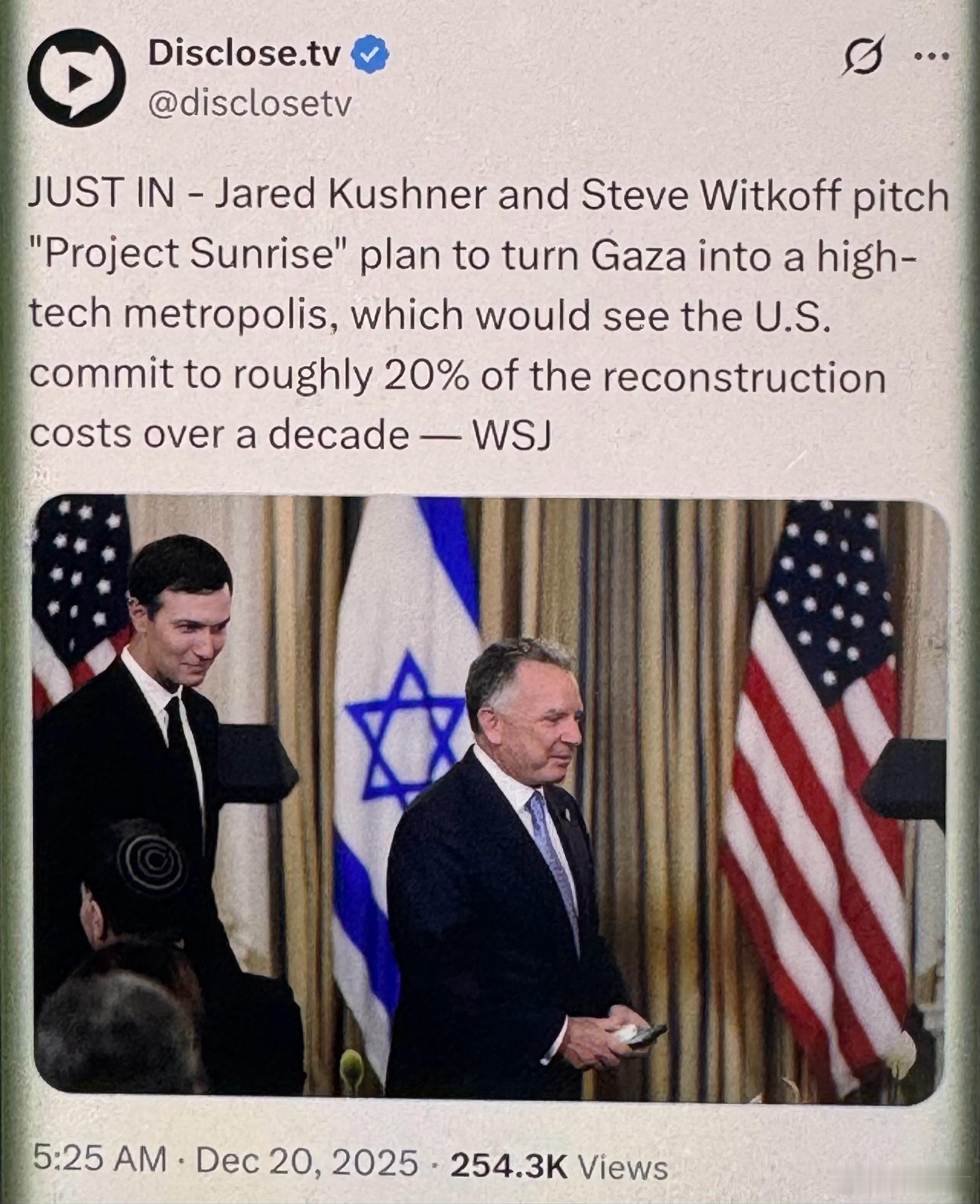 震惊!加沙最终落入美国之手!《华尔街日报》:贾里德·库什纳和史蒂夫·维特科夫提出了“日出计划”,计划将加沙变成一个高科技大都市,美国将在十年内承担大约20%的重建费用。
