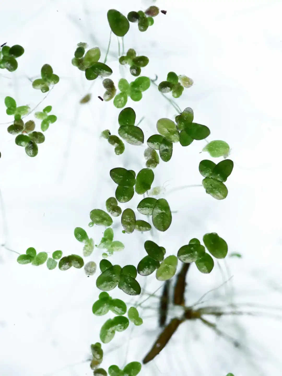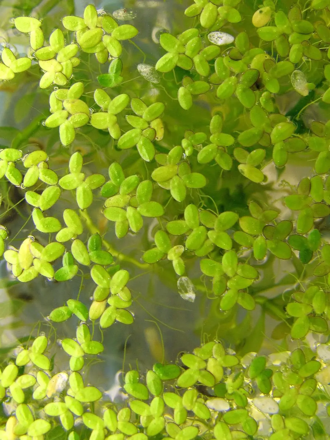 浮萍没有茎,植株主体是由叶片和根组成。叶片漂浮在水面上进行光合作用,根在水里吸水营养,因为根不着土,所以它们会随着水流漂荡。