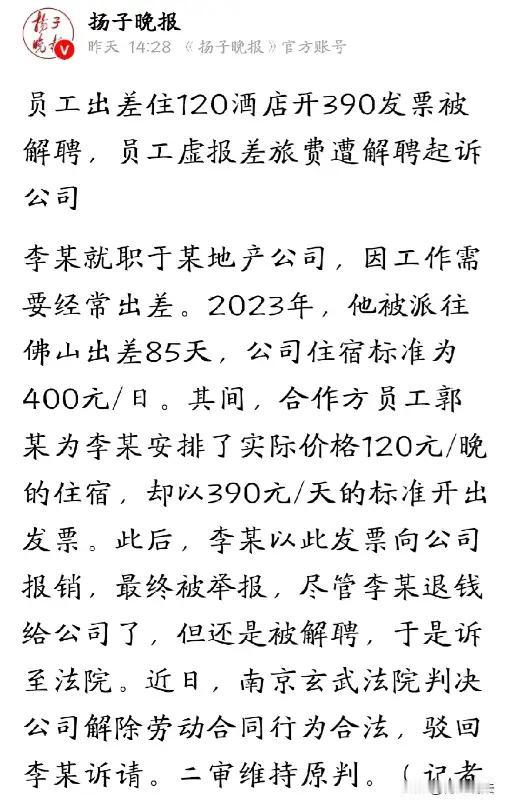江苏南京,男子李某到佛山出差85天,公司规定住宿报销标准不超400元一晚,李某为省钱,找合作方安排120元一晚的房间,却按390元开发票报销,赚了2万多差价。后被人实名举报,公司以“假公济私”将其开除,李某不服告上法庭。 南京的李某从未想过,一次长达85天的佛山出差,会让自己十年工龄戛然而止,还闹上了法庭。这本是一场常规的工作派遣,却因一笔“精打细算”的住宿费差价,变成了触碰职场红线的典型案例。 2023年,入职某地产公司十年的李某接到佛山出差任务,公司明确住宿报销标准不超过400元/晚。想着能省下一笔开支,他没有自行预订酒店,而是请合作方员工郭某帮忙安排住处。很快,郭某为他找到了一间每晚仅需120元的房间,价格远低于公司报销上限。但在报销时,李某却收下了郭某开具的390元/晚的发票,前后五次报销共申报住宿费等3万余元,悄悄赚了2万多元差价。 在李某看来,自己既没超公司报销标准,还“帮公司省钱”,赚点差价不过是“合理回报”。可他没料到,这份“精明”很快被实名举报。公司展开调查后发现,李某的实际住宿费用与报销金额存在巨大差距,且他与合作方存在资金往来,李某事后曾向郭某转账3万元,又向公司退还了2.5万元差价。结合《员工手册》中“假公济私、弄虚作假者可解除劳动合同”的明确规定,公司当即作出开除决定。 被辞退后的李某难以接受,他辩称自己“未接触酒店前台,对实际价格不知情”,认为已经退还差价就不应被辞退,将公司诉至法院,要求维护自身劳动权益。这场官司的核心争议,集中在“虚假报销是否构成严重违纪”上。 法院审理后给出了明确答案:李某多次虚假报销的行为属于持续性不当获利,明显违反诚信原则和廉洁从业要求,其“不知情”的辩解不符合常理,存在明显主观故意。更关键的是,虚假报销的认定不以是否造成公司实际损失为前提,核心在于违反了企业经营管理和廉洁文化要求。而公司《员工手册》的相关规定合法有效,据此解除劳动合同并未违反法律规定。最终,法院驳回了李某的诉讼请求,二审也维持了原判。 一场看似“省钱又赚钱”的“双赢”操作,最终以丢工作、输官司收场。李某的经历给所有职场人敲响了警钟:职场之中,诚信是立身之本,制度红线不可触碰。公司设定报销标准,是为了规范费用支出,而非给员工提供“套利空间”。所谓“小聪明”,实则是对规则的漠视,最终只会反噬自身。这场闹剧落幕,留下的不仅是一个法律判决,更是一则深刻的职场警示,守规矩方能行稳致远,任何试图钻制度空子的行为,终将付出相应的代价。出差费报销单 佛山旅行酒店