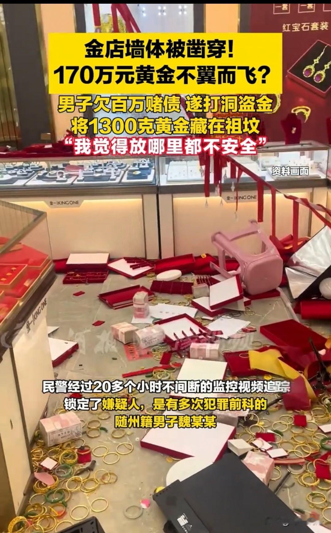 武汉,一男子在手机店的墙壁上凿了一个大洞,爬进了金店,偷走了1700多克黄金,价