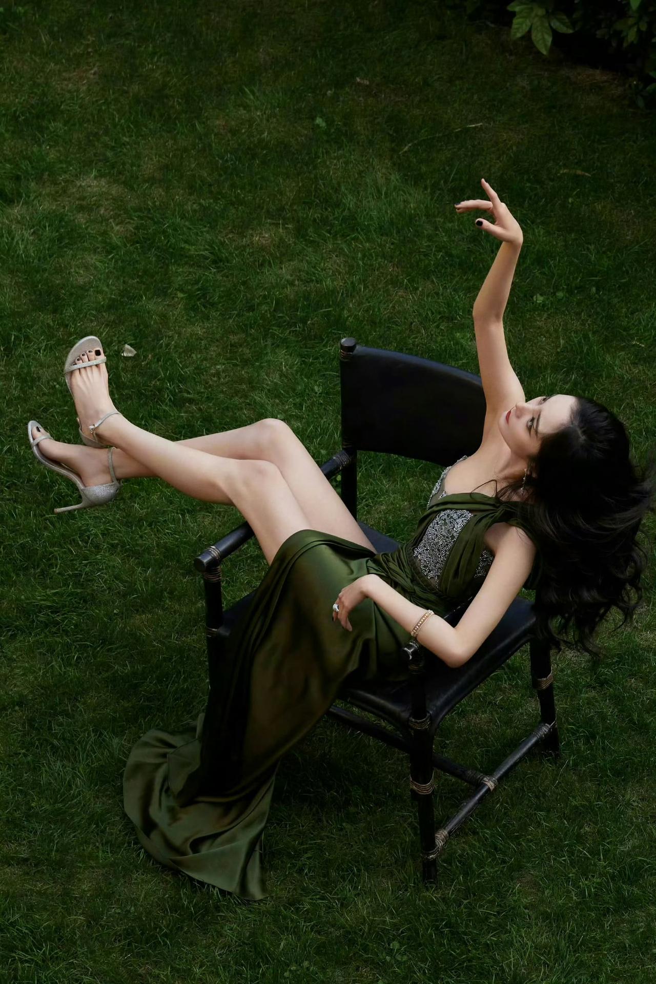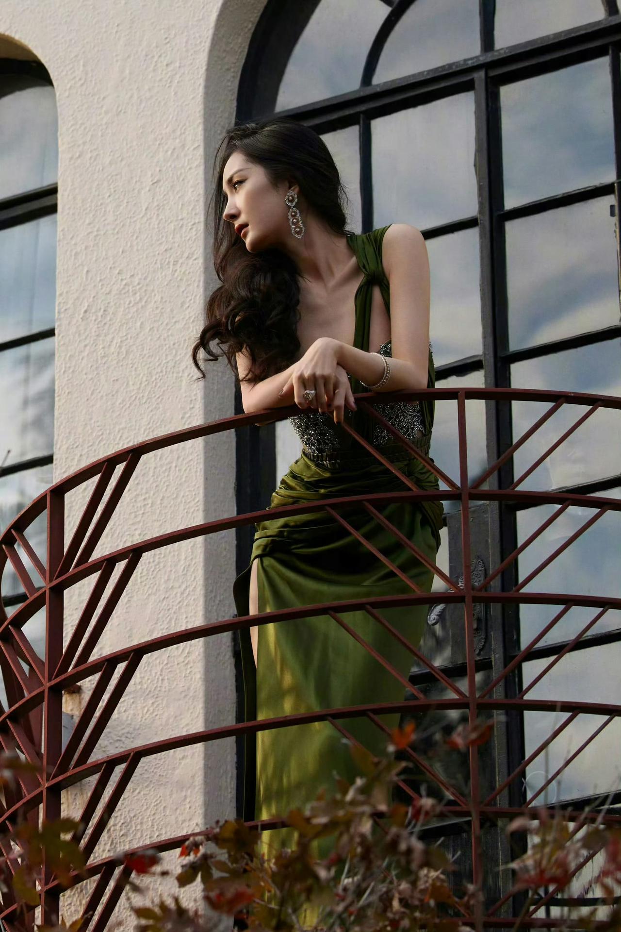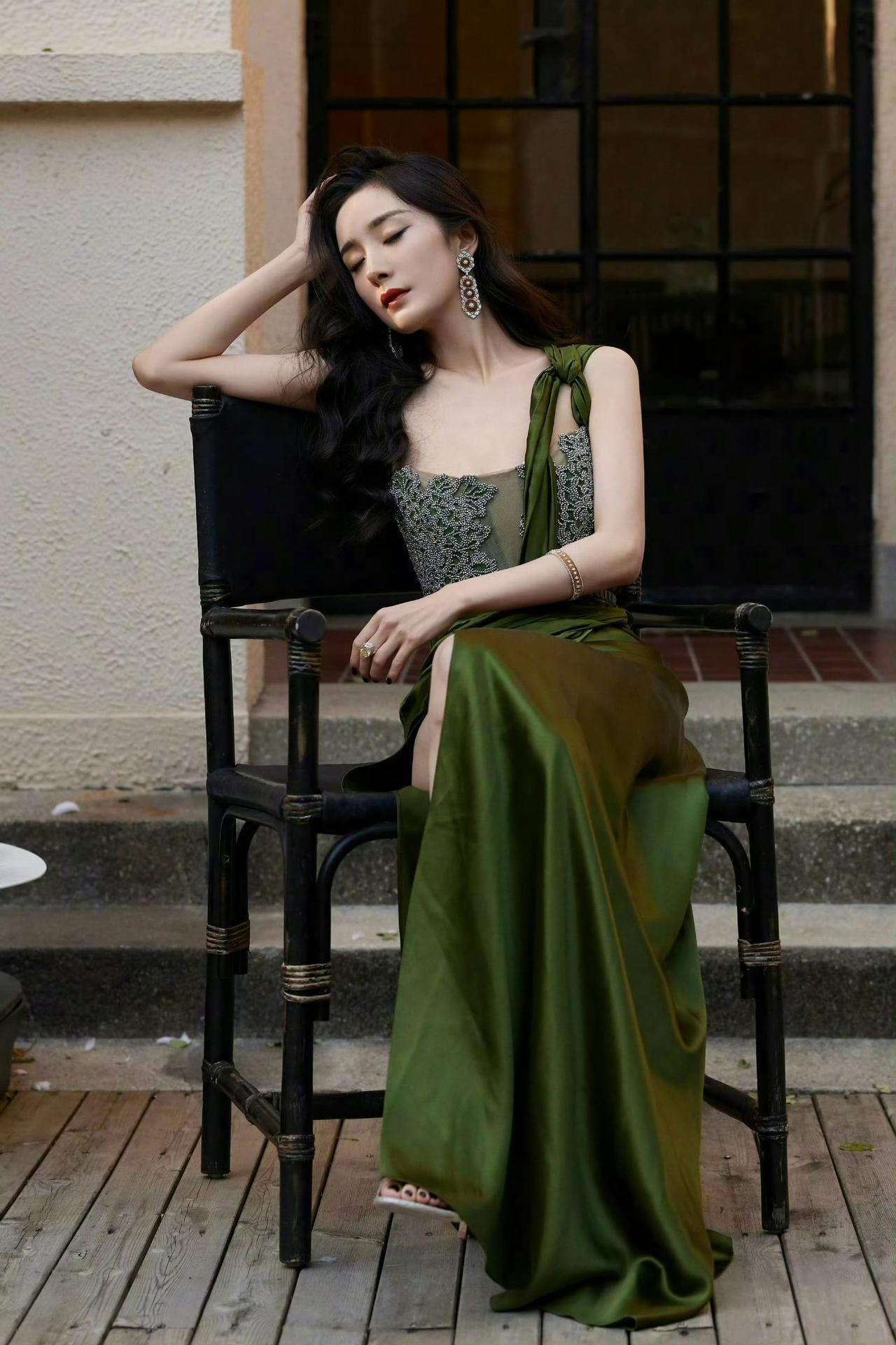 优雅绿裙女子,沉思于古朴椅上,复古风韵扑面而来。杨幂。