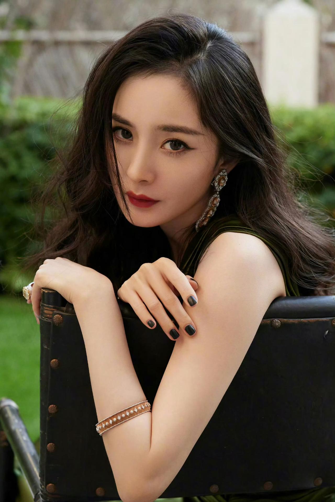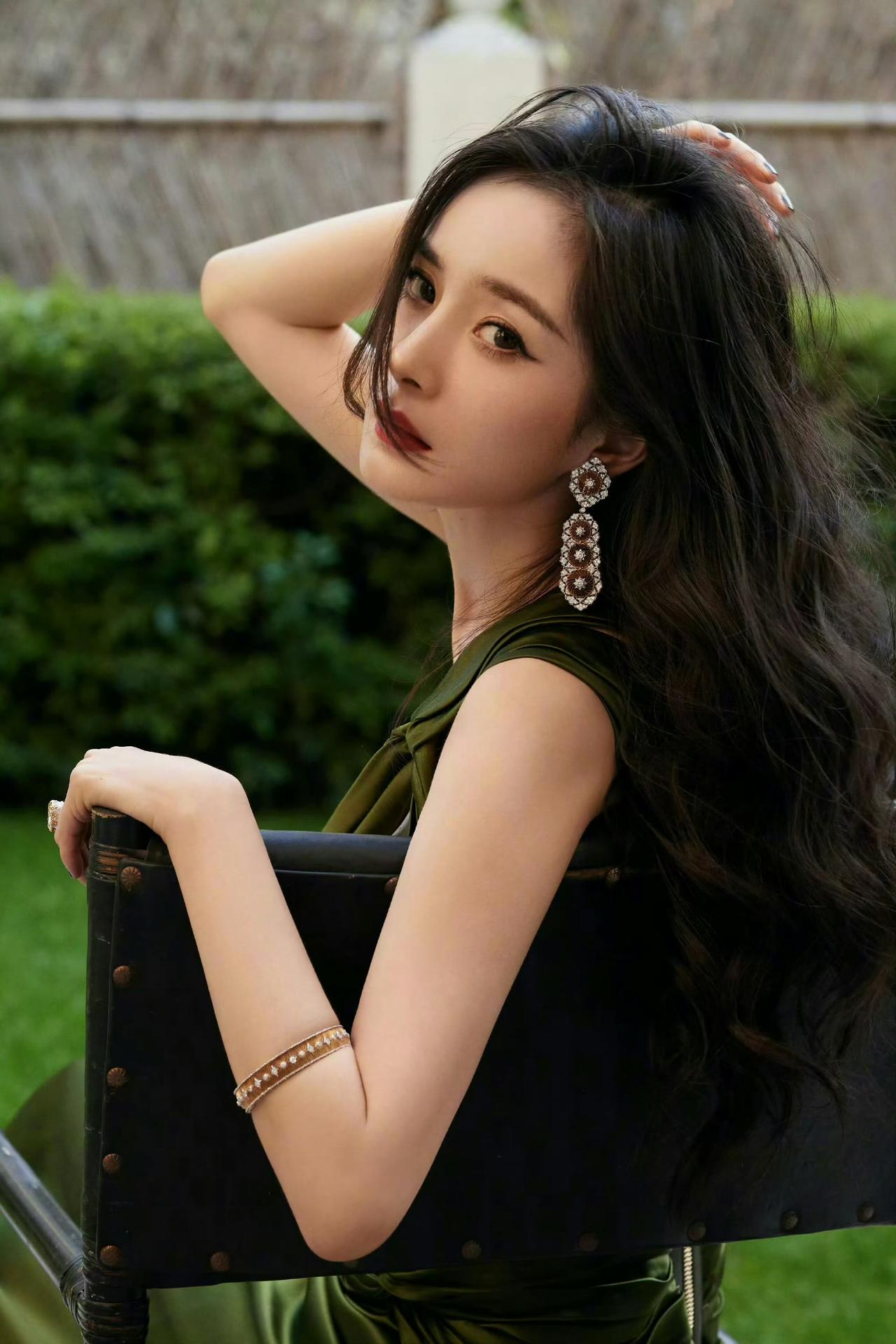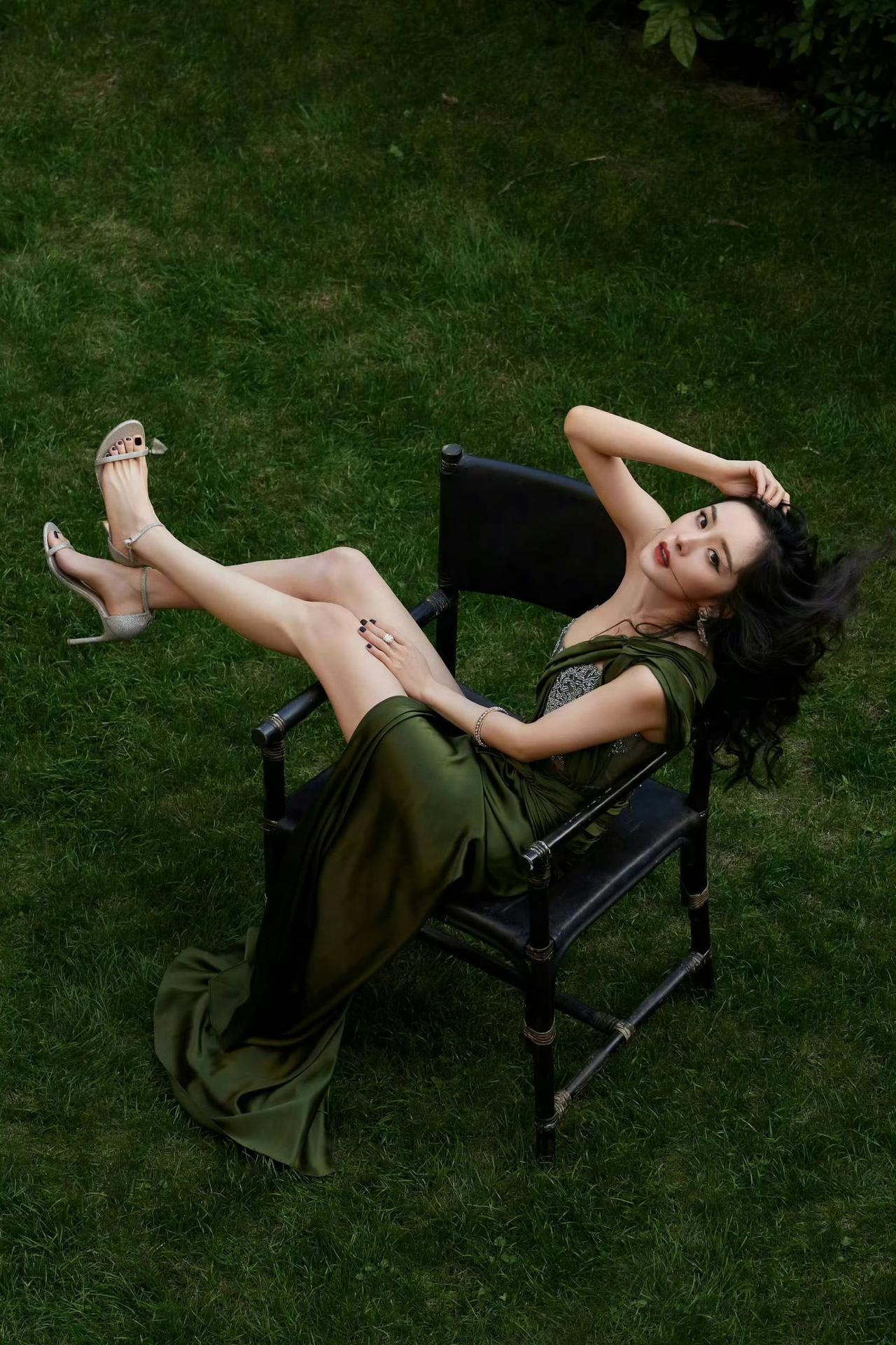 优雅绿裙女子,沉思于古朴椅上,复古风韵扑面而来。杨幂。
