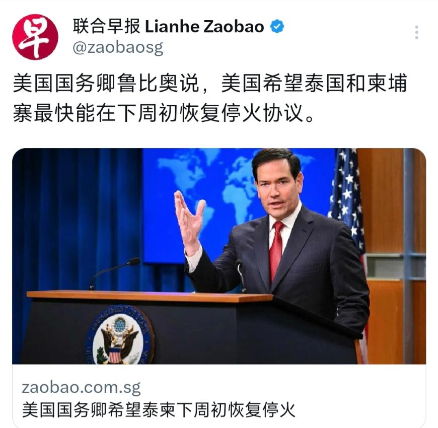 12月20日,新加坡联合早报发布:“美国国务卿鲁比奥说,美国希望泰国和柬埔寨最快