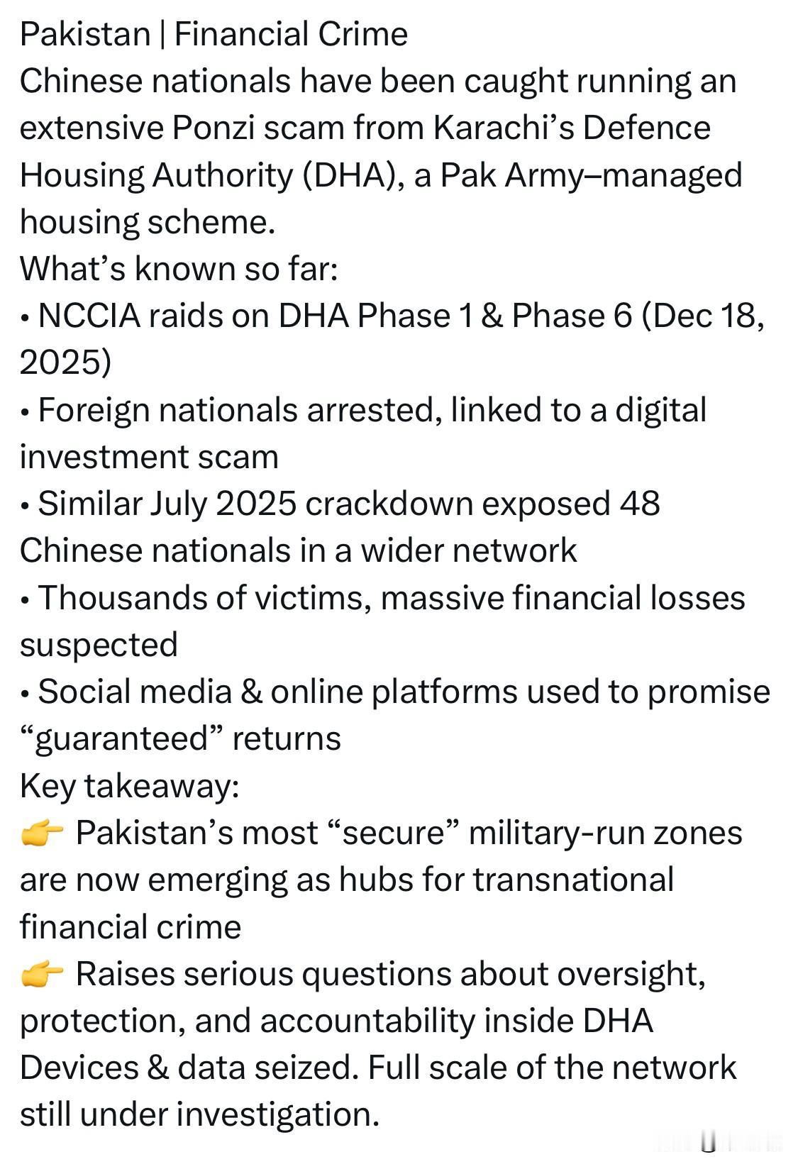 2025年12月18日,巴基斯坦国家网络犯罪调查局(NCCIA)联合情报部门及执法机构,在卡拉奇的国防住房管理局(DHA) 1期和6期展开突击行动,捣毁了一个由外籍人士运营的大规模庞氏骗局网络。 以下是该事件的核心细节: 逮捕情况:多名外籍人员(包括中国公民)在此次行动中被拘捕。此前的2025年7月,巴基斯坦警方也曾在费萨拉巴德逮捕了149名涉嫌运营庞氏骗局的人员,其中包括48名中国公民。 被捕嫌疑人包括:中国 44 名男性和 4 名女性,尼日利亚 3 名男性和 5 名女性,菲律宾 1 名男性和 3 名女性,斯里兰卡 1 名男性和 1 名女性,孟加拉国 6 名男性,津巴布韦 1 名女性,缅甸 2 名女性,以及巴基斯坦 76 名男性和 2 名女性。 作案手段:该犯罪网络通过社交平台(如WhatsApp、TikTok和YouTube)招揽数千名受害者,诱骗其参与虚假投资。他们通常承诺极高回报,并利用后期投资者的资金支付给早期投资者,导致大量民众面临严重的财务损失。 物证调查:执法人员在现场查获并提取了大量“重要且敏感”的数字数据及电子设备,目前正用于进一步追踪该网络的完整规模和其他嫌疑人。 案件背景:该诈骗团伙利用DHA(巴基斯坦陆军管理的住宅区)这一高端区域作为据点,以掩盖其非法活动。此类网络诈骗通常涉及博彩、非法贷款APP、虚假投资以及利用虚拟货币或非法汇兑(Hawala/Hundi)将资金转移出境。