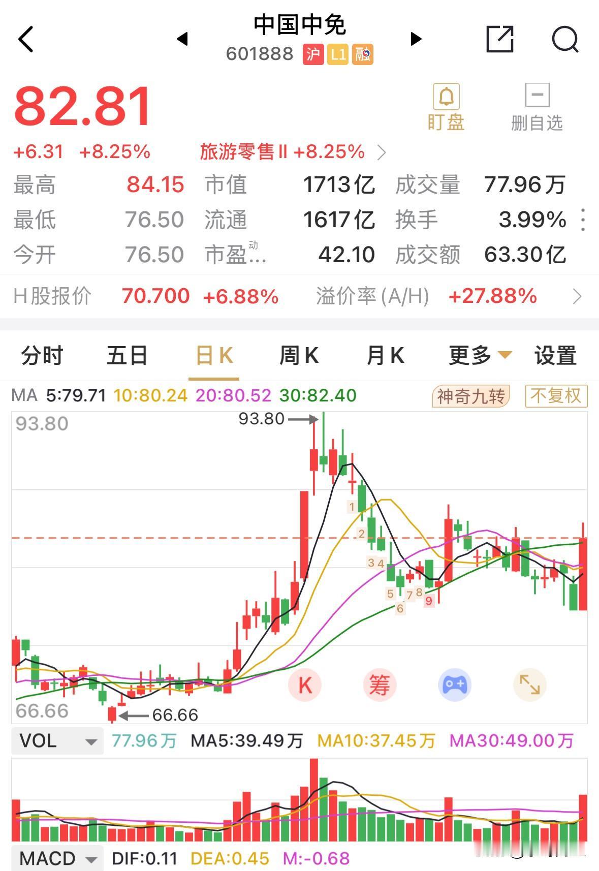 中国中免这免税店概念龙头,大涨8.25%,盘中一度涨停,可惜资金封板意愿不强,涨幅与旅游零售板块涨幅相等。 海南正式封关,未必在短时间内能有效提升其经营盈利能力,近两年连续同比下跌的净利润及营收,是否能真正的改善才是值得关注的重点。 中国中免42倍的估值,需要年度至少增长30%才能够匹配共估值,26年的预期应至少盈利60亿元左右。 这能做到吗? 中国中免曾经股价超400.0元,一波轰轰烈烈的行情下,又回到了原点,留下了满地鸡毛,现价如今仅股价高点20%左右。 个人观点,勿作操作建议。