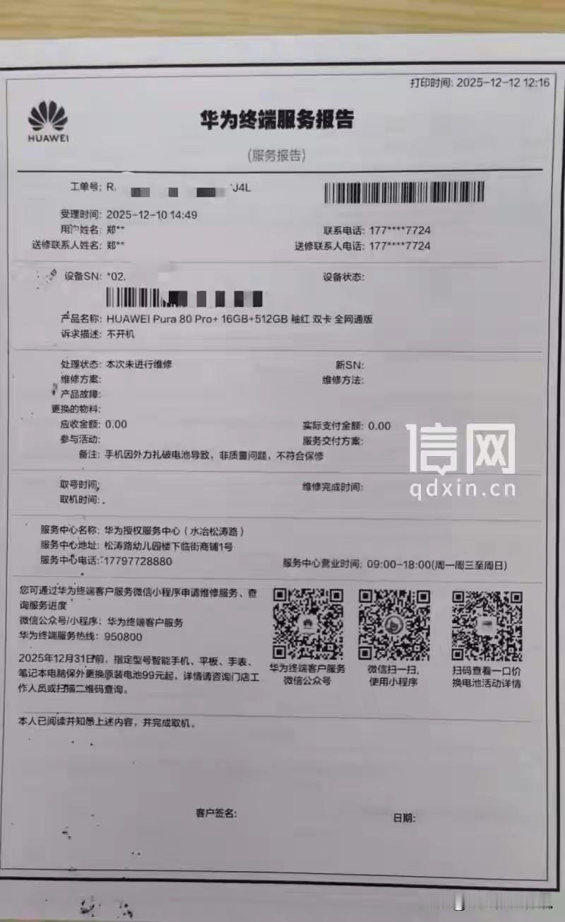 河南安阳,男子花6005元,买了一部华为Pura 80 手机,充电时突然着火,从桌上摔到地下,冒黑烟、喷火星,满地黑色粉末,手机后盖翘起、机身变形,已报废了。男子当天就到某华为授权中心进行检测,并提出全额退款,或者换新机。售后拍了几张照片拿去检测,检测结果:非质量问题,不符合保修条件,要修自己掏钱。男子:只凭照片就出具检测报告,这不是把工作当儿戏,把客户当猴耍吗? 郑先生在10月1日,托朋友在郑州某华为授权店花了6005元,买了一部Pura 80 手机。 10月3号,郑先生收到了手机,当即就迫不及待的激活了手机。 这款手机是他的心爱之物,平时使用的非常仔细,连个小磕小碰都没有。 可就在12月10日的中午,他把手机放在桌子上充电,用的是原装充电器。 他在另一个电脑桌旁玩游戏,两边相隔1米多远。 突然就听着砰的一声,他扭头一看,发现手机已经掉到地上起火了。 手机升腾着黑烟,往外喷着火星子,地上黑色的粉末落的满地都是。 郑先生跳起来冲过去,拔下了充电器。 手机熄火后,郑先生发现,手机已经报废了,铝硅的玻璃后盖翘起来老高。 紫色的玻璃面,满是裂纹,被烧的黑乎乎的已经变形,他心疼的都不忍看。 房间里的那股烧焦的臭味,三四天都散不出去,大冬天的房门开着,窗户开着仍不能住人。 郑先生又惊又怕,幸亏当时自己就在旁边,如果当时家里没人,后果不定会怎么样。 他无论如何也想不通,6000块钱买的手机,刚用两个月就这么报废了? 郑先生不敢耽误,当天下午就带上手机,来到安阳某华为授权服务中心进行检测。 他认为自己刚买了两个多月的手机,就发生这样的问题,明显就是质量问题。 而且手机也在保质期内,他要求换一台新手机。 售后接过他的手机看了看,就把手机放到了台子上,拍了几张各方位的照片。 郑先生问工作人员,手机电池为什么会着火,售后称,这种情况一般有两种可能。 一、是后壳本身碎裂,摔落时扎破电池导致。 二、是手机从桌面摔落,导致玻璃后壳摔碎后玻璃划伤电池引发。 两天后也就是12月12日,检测报告出来了,认定系“人为外力致电池受损”,非质量问题,不符合保修条件。 售后给出维修方案:如果郑先生想修手机,需自己掏钱。 郑先生无法接受,手机充电时距离自己1米多远,肯定不是自己碰落的。 听到动静时,手机已经掉到地上,是不是因电池起火爆了,把手机嘣到在地上的,他不确定。 郑先生称,桌面距地面的高度不到1米。 如果手机摔到地上就能摔坏,还摔的着火燃爆,这6000块钱买的手机,太不咋地! 这难道这还不算是手机的质量问题吗? 而最让郑先生无法信服的是,还是工作人员的检测方式。 当时明明手机就在那里,他们却只拍了几张照片拿去检测。 正常的流程,不应该是对手机实物进行监测为准吗? 而且只用了几张照片,就出具检测报告,这不是把工作当儿戏,把客户当猴耍吗? 郑先生气的不行,当场拒绝了工作人员让他自费维修的方案。 他坚持要求全额退款,或者换新手机,但对方没答应,双方协商失败了。 因此他对这款品牌手机的预期期值,也降到了冰点。 记者在华为官网上看到了,包括华为Pura 80系列手机的宣传信息。 宣传的是,手机采用第二代玄武钢化昆仑玻璃,耐摔能力提升25倍、抗刮能力提升16倍。 并配以抗刮耐摔、靠得住、坚固耐用、可靠安心的醒目词汇。 客服称,事件与产品设计及质量无关。 并且无法满足郑先生全额退款,或更换新机的要求,若选择维修,费用需自行承担。 《消费者权益保护法》第24条:经营者提供的商品或者服务不符合质量要求的,消费者可以依照规定、当事人约定退货,或者要求经营者履行更换、修理等义务。 没有规定和当事人约定的,消费者可以自收到商品之日起7日内退货; 7日后符合法定解除合同条件的,消费者可以及时退货,不符合法定解除合同条件的,可以要求经营者履行更换、修理等义务。 依照前款规定进行退货、更换、修理的,经营者应当承担运输等必要费用。 郑先生花6005元购买的手机,在正常充电时起火报废,且手机尚在保修期内,明显不符合消费者对手机质量的合理预期,属于“商品不符合质量要求”的情形。 根据该条款,郑先生有权要求履行更换新手机,或全额退款的义务,华为售后以“人为外力致电池受损”拒绝,缺乏足够依据,未充分保障消费者的合法权益。 《产品质量法》第31条:因产品缺陷造成人身、他人财产损害的,受害人可以向产品的生产者要求赔偿,也可以向产品的销售者要求赔偿。 属于产品的生产者的责任,产品的销售者赔偿的,产品的销售者有权向产品的生产者追偿。 华为售后仅通过几张照片,就认定是人为原因,拒绝承担责任。 在未充分举证的情况下,不符合该条款规定,郑先生有权要求其承担相应赔偿责任。 对此你怎么看?