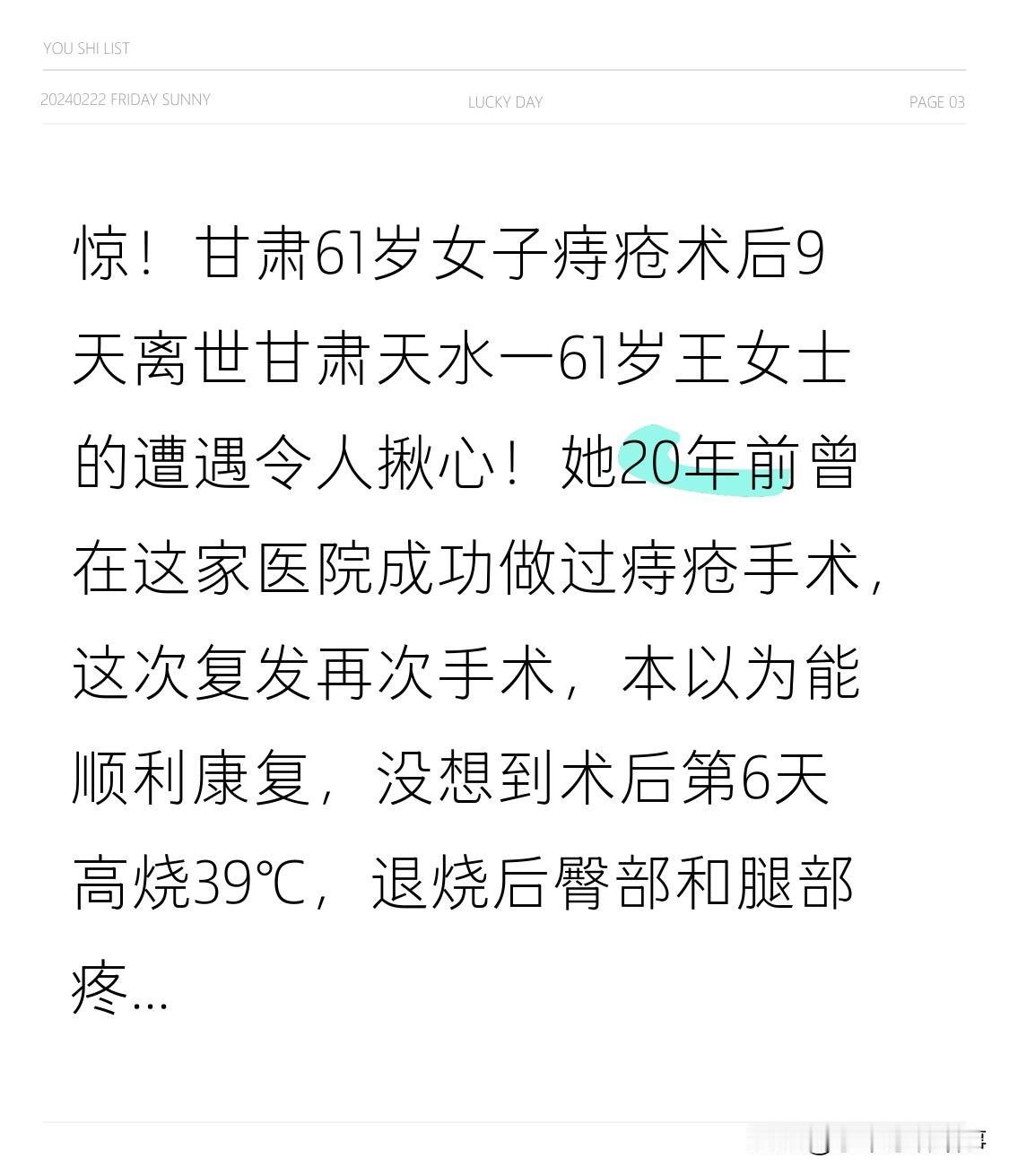 惊!甘肃61岁女子痔疮术后9天离世 甘肃天水61岁王女士的遭遇令人痛心。20年前她曾在该医院成功进行痔疮手术,此次复发再次手术,本以为能顺利康复。术后第6天高烧39℃,退烧后臀腿疼痛,家属多次反馈,医生称属正常。12月11日病情恶化去世。尸检已完成,家属质疑检查不足,当地卫健委介入,真相待明。