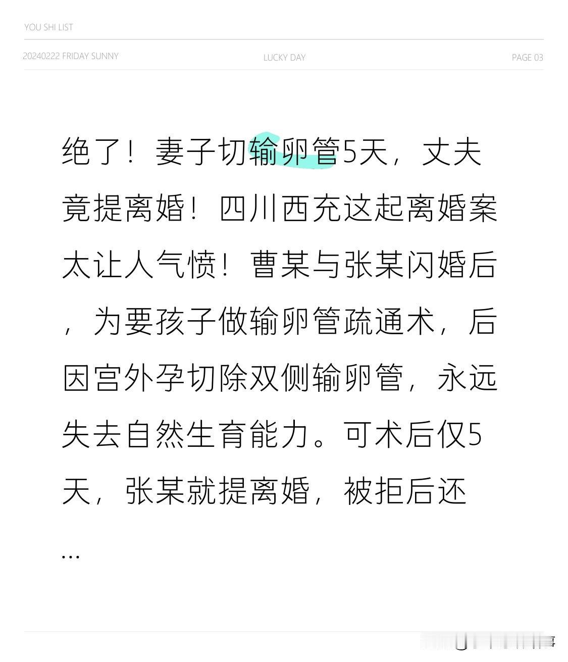 太离谱了!妻子切除输卵管仅5天,丈夫竟提出离婚! 四川西充这起离婚案着实令人气愤!曹某和张某闪婚后,为求子曹某做输卵管疏通术,却因宫外孕切除双侧输卵管,彻底丧失自然生育能力。术后才5天,张某就提离婚,遭拒后殴打妻子,被派出所告诫。起诉离婚被驳回,他换锁将妻子赶出家门。曹某索赔27万,法院仅酌定补偿3.46万,合理吗?
