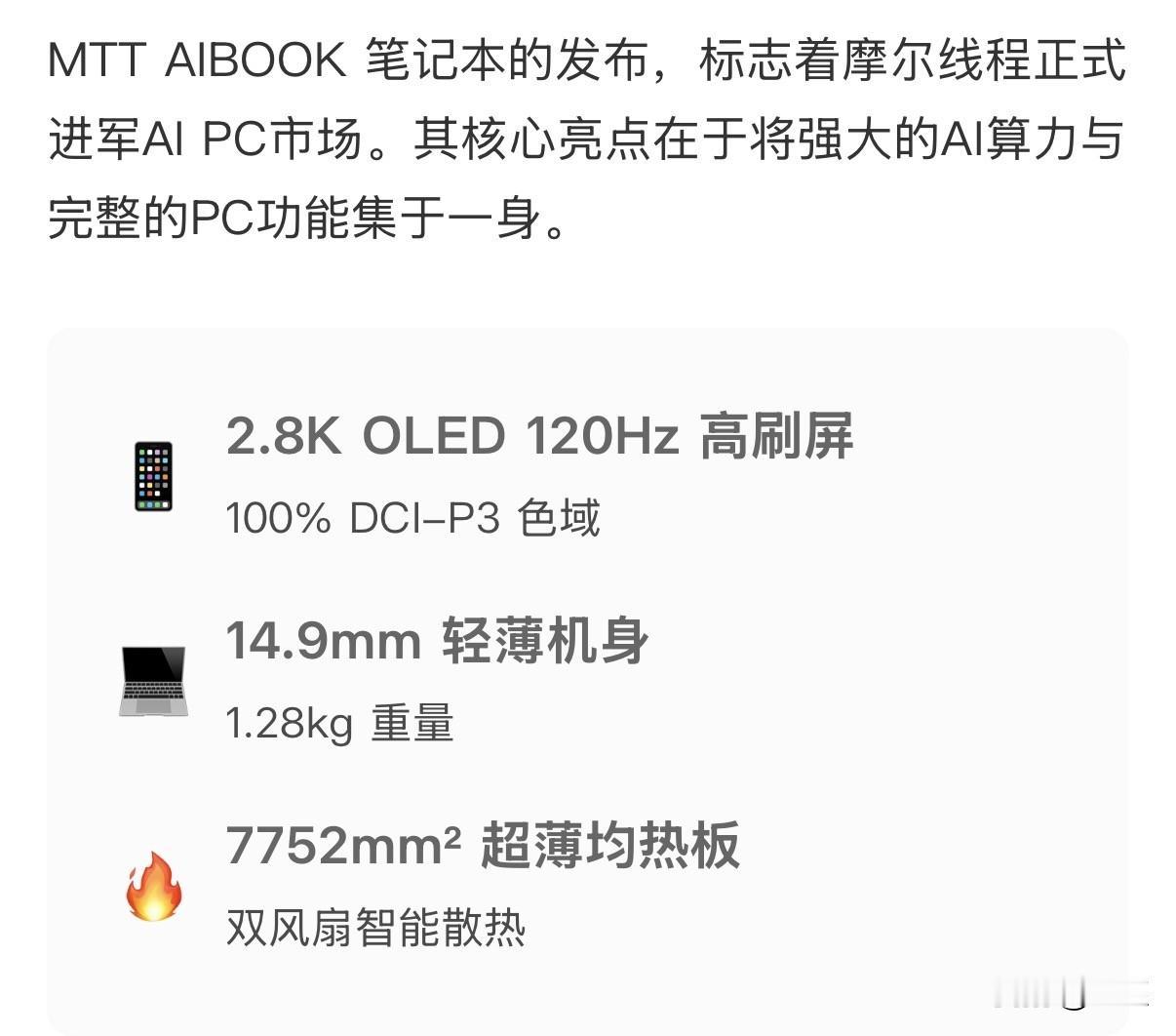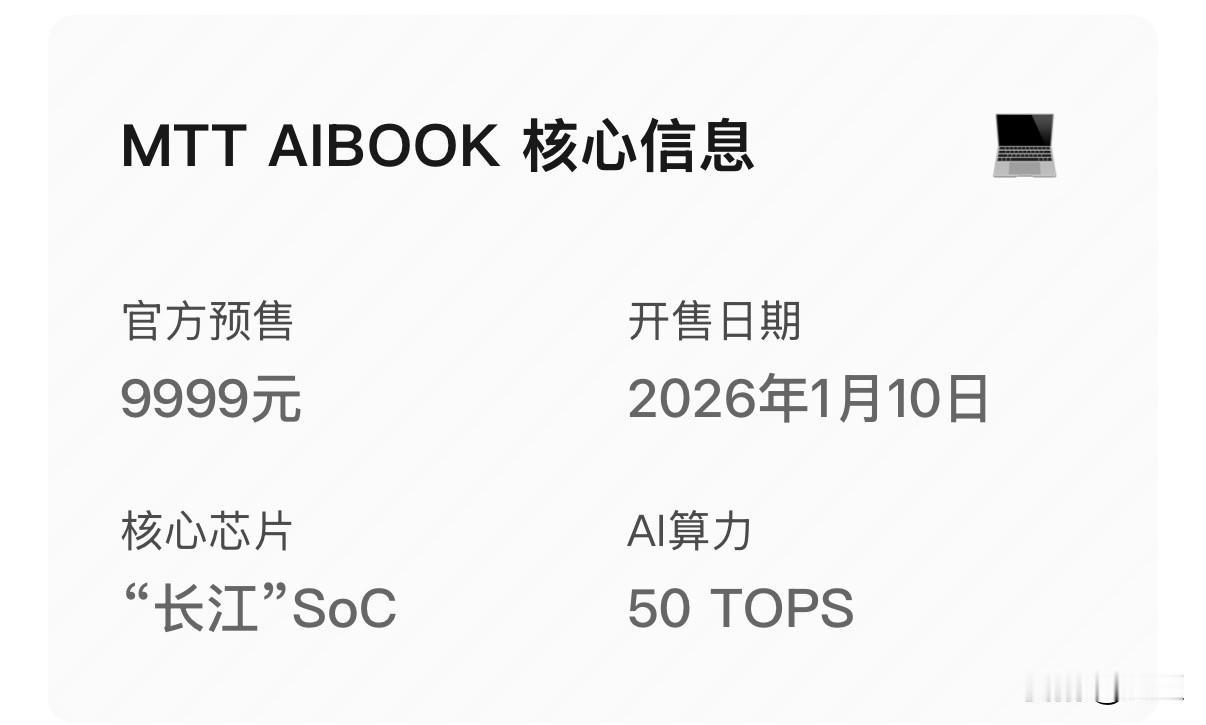 在2025年12月20日举行的首届MUSA开发者大会上,摩尔线程正式发布了其首款AI算力笔记本—— MTT AIBOOK 。 开启了国产AI PC的新篇章。 MTT AIBOOK 笔记本的发布,将强大的AI算力与完整的PC功能集于一身。 MTT AIBOOK 笔记本的强大性能源于其搭载的“长江”智能SoC。这是一款高度集成的系统级芯片,集成了CPU、GPU、NPU、VPU等多种计算单元,旨在为AI PC应用提供强大的异构计算能力。 AI算力笔记本 AIBOOK