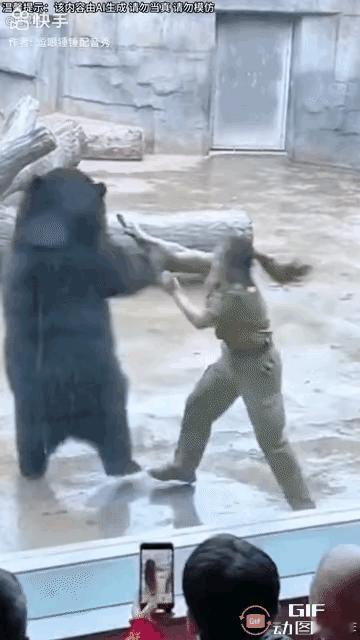 黑熊厌倦了表演,于是和驯兽师发生了冲突,但是最后这个黑熊并没有伤害驯兽师,看到这样的画面之后,又让我产生了感慨,不知为什么,我非常讨厌强迫动物表演的行为,野生动物就应该让它们在大自然中快快乐乐,自由自在的生活,可是有些人偏偏就喜欢看它们的表演,为了学会表演节目,这些可怜的动物从小要遭受多少苦难!