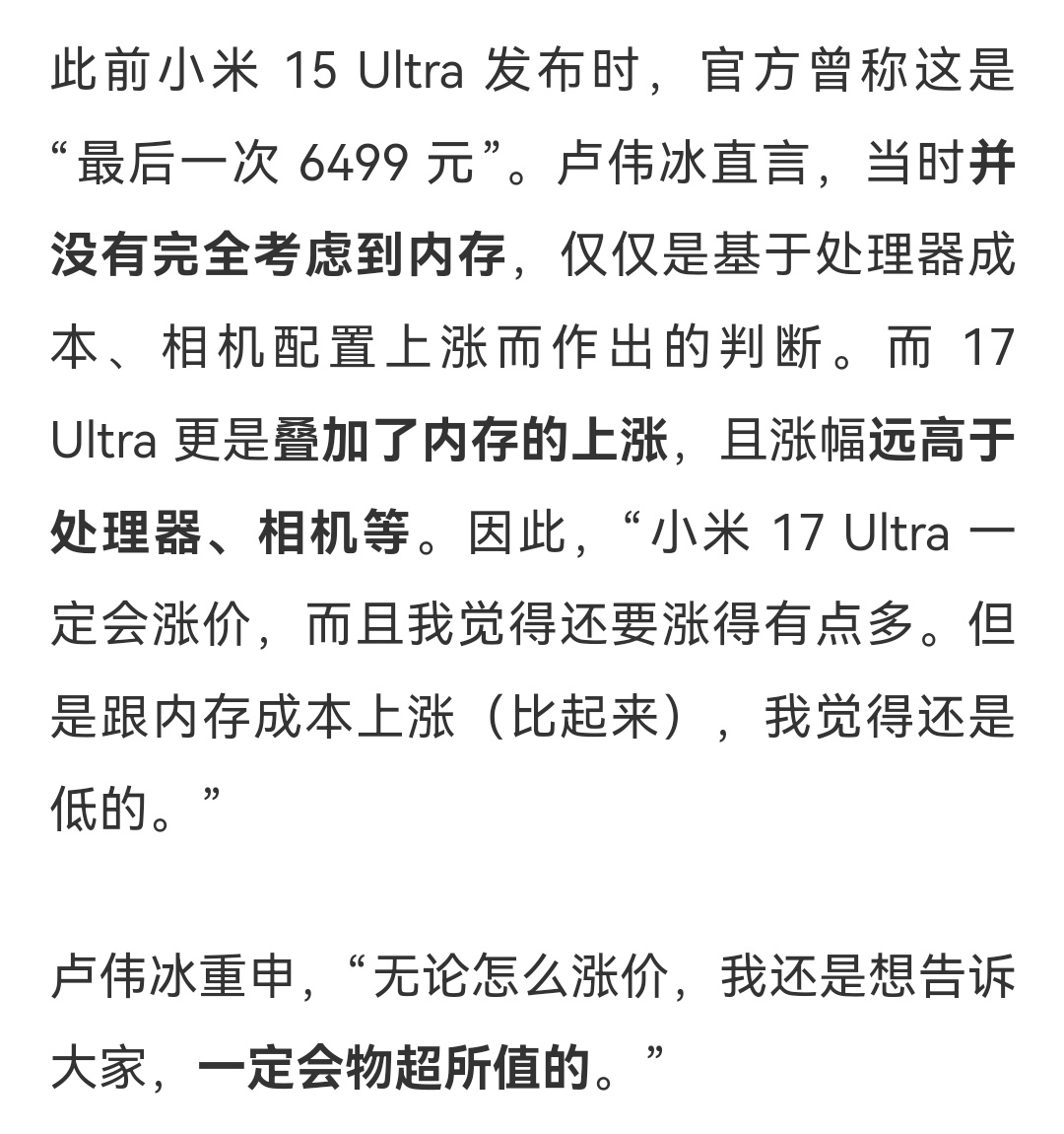 看来小米17 Ultra真要涨价了,不过现在内存涨价确实没办法,但还是希望最终价格能有惊喜吧。