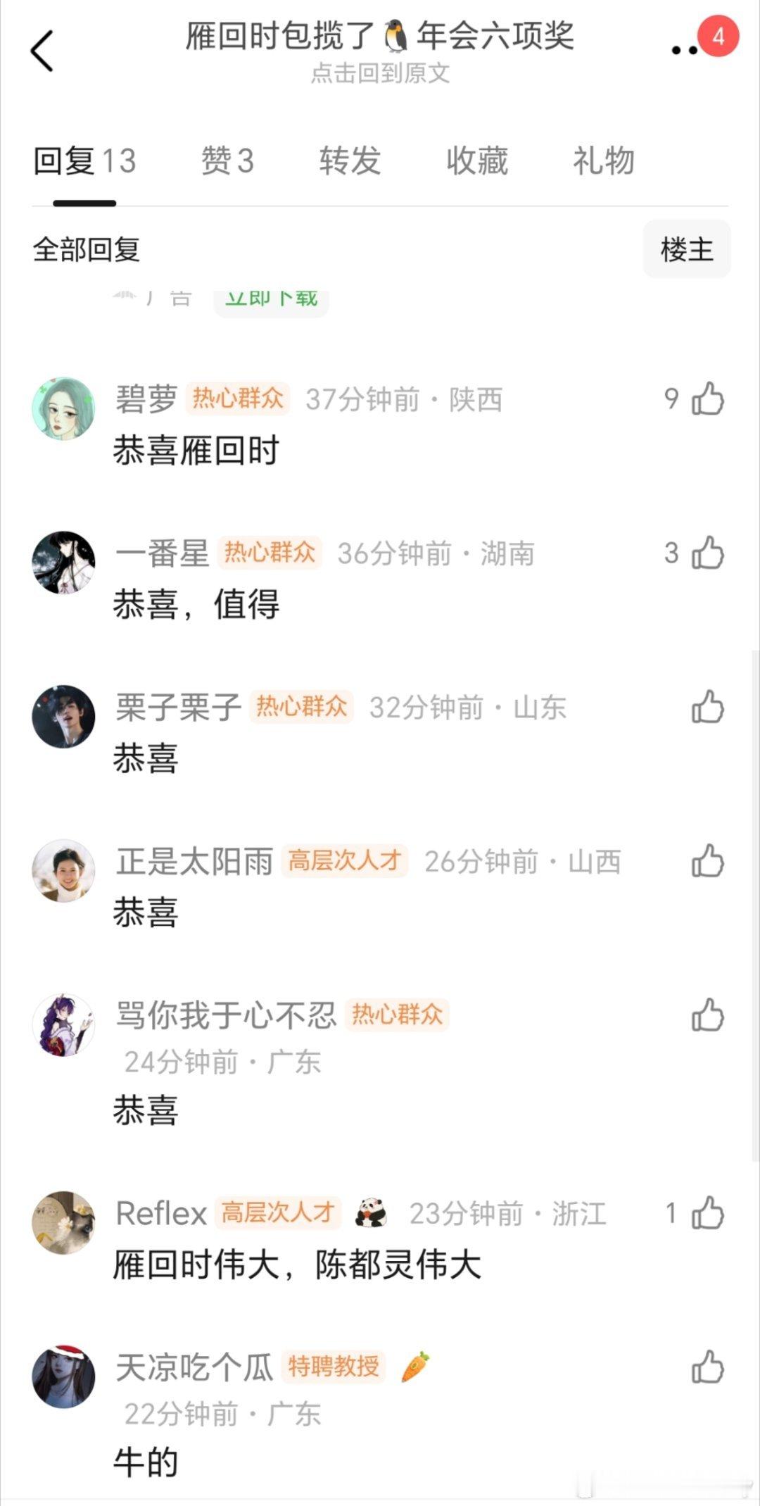 星光大赏时间腾讯年度爆剧之所以把《雁回时》划分为爆剧,主要原因还是因为人抬剧,用最差的班底在最冷的大盘里拿下最好的成绩,陈都灵一个人扛起了所有,招商、剧宣+云包场,整部剧全员上桌,大出圈+各种名场面,唯一不足的是cp没起来,如果cp起来了可能播放量会更高!