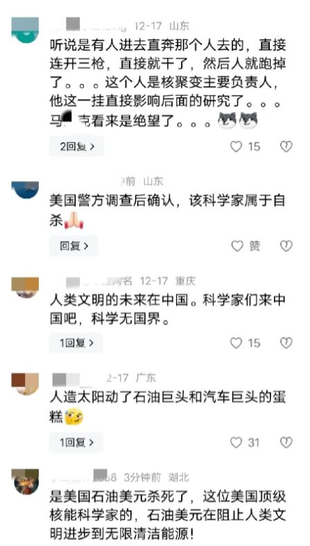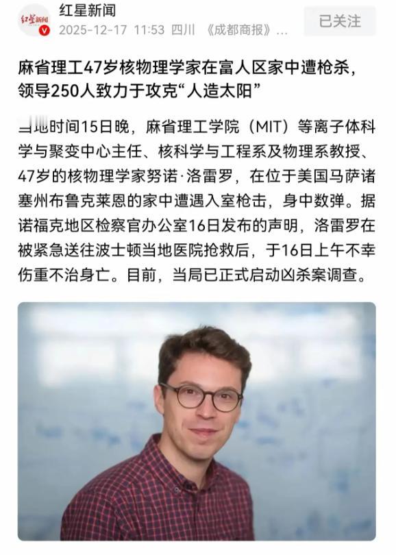 美国的核聚变首席科学家被枪杀了! 洛雷罗可不是光会搞学问的“书呆子”,而是能把一帮天才科学家拧成一股绳的“主心骨”。 麻省理工核聚变团队,在他带领下,几年时间内搞出了不少突破,离“人造太阳”点火也就差那么一口气。 可惜天有不测风云。12月15日深夜,他在波士顿富人区的家中被人枪杀。消息一出,不光麻省理工的师生全傻了眼,全美甚至全球的能源科技圈都在问: 这是不是巧合?还是有人不希望核聚变项目太顺利?你说一个科学家,做实验、写论文、带团队,按理说跟“枪杀”八竿子打不着。 可偏偏他做的项目,直接关系到未来的全球能源大洗牌。要真让他成功了,煤老板、油老板、甚至新能源大佬,都可能得重新洗牌。这样一想,这场命案就显得不那么简单。 说到核聚变,可能不少人第一反应就是“听说过,但没见过”。其实,这玩意儿就是把两个轻的原子核“合二为一”,释放出巨量能量。 太阳能量就是这么来的,所以叫“人造太阳”一点都不过分。如果科学家真能像太阳那样搞定核聚变,人类就能源无忧了。 石油、煤炭这些传统能源,分分钟就成“老黄历”。而且关键是,这能量用不完、取之不竭,简直跟“开挂”一样。 有些人还觉得核聚变和咱中国没啥关系。其实不然,核聚变是全球科技大国的终极“必争之地”。谁先突破,谁就能掌控未来能源的话语权。 咱中国这几年在核聚变上也没闲着,不但自己搞实验,还和国际大项目有深度合作。 美国的麻省理工搞得热火朝天,咱中国的“东方超环”也时不时传来好消息,这场竞赛比奥运会还刺激。 要说核聚变一旦成功,最先哭的肯定是传统能源大佬。你想想,油田、煤矿、天然气,这些靠能源吃饭的巨头,几十年积累的市场和资本,一夜之间可能全得改行。 石油美元、能源地缘政治,那些老把戏可能都得“下岗”。但别忘了,还有一批这几年刚混出名堂的新能源玩家。 这些新贵本来以为能靠环保、清洁能源“吃香喝辣”几十年,结果核聚变一来,成本低到“白菜价”,没污染还能全天候供能。 你说光伏板还能卖得动吗?风电场还会有人投吗?新能源的“新”,可能一夜之间变成“旧”。所以说,核聚变的出现等于把整个能源牌桌重新洗了一遍。 老油条、新玩家,大家都得坐立不安。科学家们在实验室调试设备,外面资本、政策、利益团体却早已暗流涌动。这时候,哪怕你是顶级物理学家,也难免被卷进风波。 美国这些年,科技圈高调归高调,危险也不小。你看,前有人工智能领域的科学家离奇死亡,如今轮到核聚变的“领头羊”遇害。 有人说是巧合,有人说是利益冲突太激烈,反正大家都知道,顶尖科学有时候比谍战片还精彩。洛雷罗出事,最先警觉的其实就是美国自己。 有人担心这会不会让整个核聚变项目停摆,甚至有人怀疑,是不是有人故意“下黑手”,给科技发展添堵。毕竟,这不只是科学界的事,更是国家层面的博弈。 美国媒体一边倒地喊“悲剧”,但背后的资本、能源大亨,估计也在暗暗盘算:核聚变进度是不是会慢下来?我的投资还能不能保住? 这就是现实世界,科学家在前线拼命,背后各路人马也在“斗法”。咱中国的朋友肯定也很关心:这种核聚变“宫斗戏”,咱中国能不能少走点弯路? 其实,咱中国在核聚变领域起步不算早,但追赶得相当猛。什么“东方超环”、中国环流器、国际热核聚变实验堆(ITER),全都有咱中国科学家的身影。 甚至有不少外国专家,都得佩服咱中国的科研速度和工程能力。咱中国的优势,就是一旦决定下场,资源、人才、政策全都能拧成一股绳。 美国麻省理工有250人的团队,咱中国的核聚变基地也是几百上千人在日夜奋战。虽然大家都还在“烧钱阶段”,但谁能率先点亮“人造太阳”,是谁都看得明白的硬实力比拼。 而且,咱中国科学家一般都低调务实,不太爱出风头。你很少听说哪个带头人突然“失踪”或者“遇害”。 这跟美国那种资本、政治、利益搅成一锅粥的生态,真不是一个画风。安全稳定,反而让咱中国的科研能静下心来搞突破。 说到底,科技前进是挡不住的。不管背后是谁不愿意看到“人造太阳”点燃,这个梦想终究会被越来越多的人点亮。 咱中国在核聚变赛道上,既要吸取别人的经验,也要警惕各种“搅局者”。只要我们坚持自主创新,保护好科学家,让他们安心搞研究,迟早会有咱中国自己的“人造太阳”升起。 能源革命的大门已经敞开,未来属于那些敢于梦想、敢于拼搏、敢于突破的人。洛雷罗的倒下,只会让更多科学家奋起直追。世界很大,风浪再大,科技的春天终究不会缺席! 咱中国加油,全世界的科学家加油。等到那一天,地球真的拥有了“人造太阳”,人类历史又会翻开崭新的一页! 参考资料: 《麻省理工47岁核物理学家在富人区家中遭枪杀,领导250人致力于攻克“人造太阳”》——红星新闻