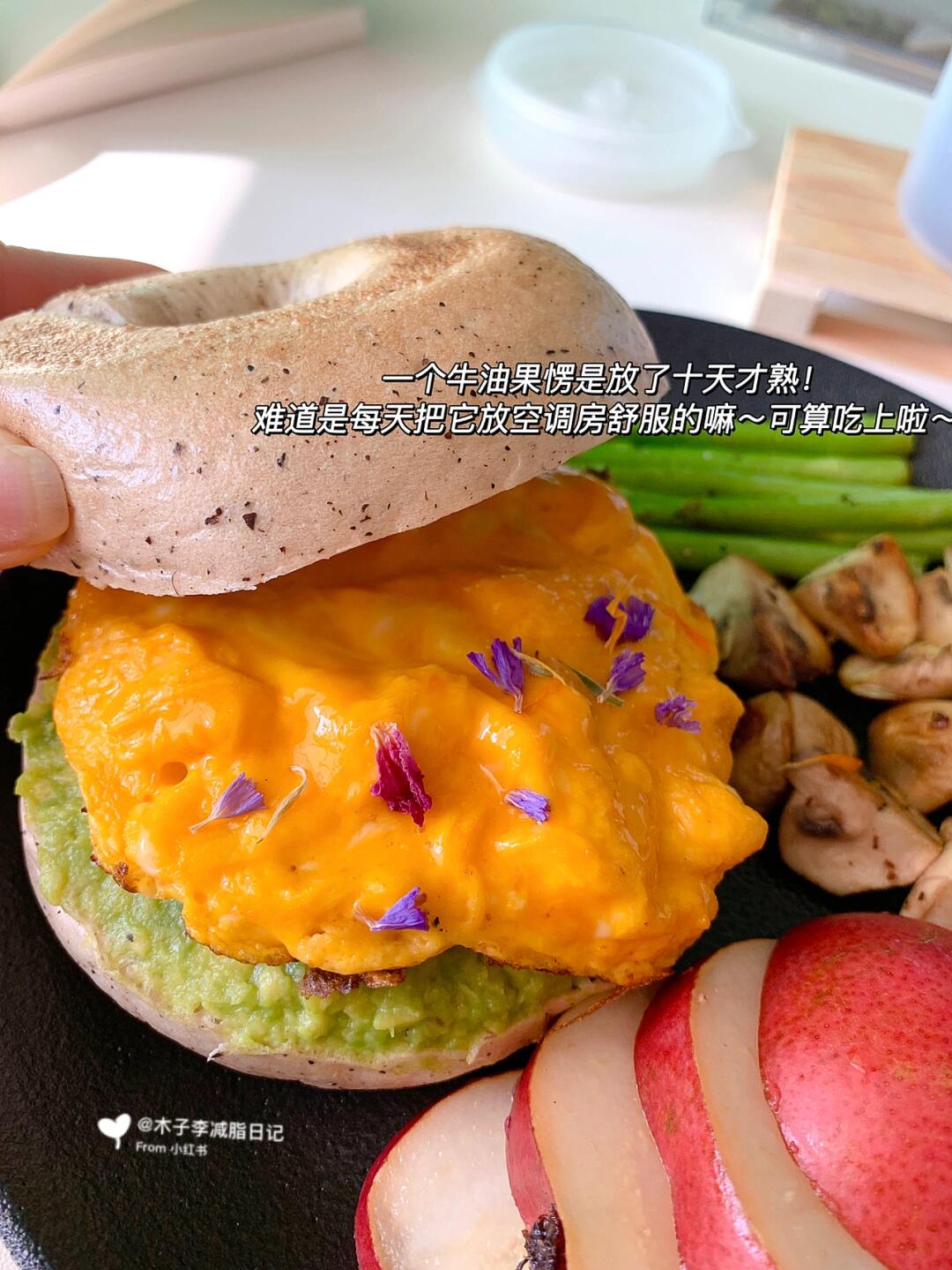 我的牛油果🥑在每天高温40°的天气硬生生的10天才熟[捂脸R]早餐就安排上经典吃法配上滑蛋搭配贝果超满足[萌萌哒R]