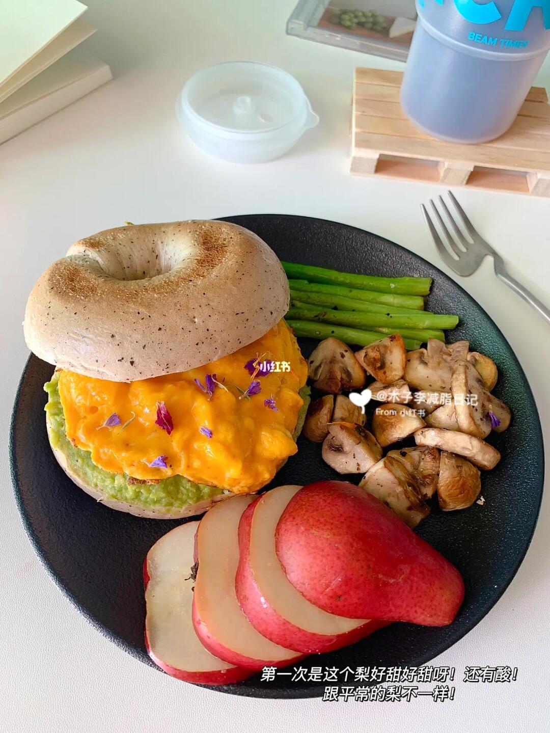 ☀️早餐:啤梨|牛油果🥑滑蛋贝果|袋泡咖啡|口蘑|芦笋|
