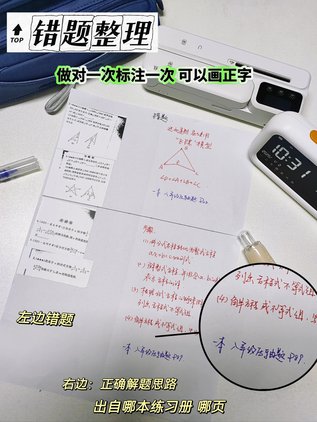 右边记录正确解题思路和出自哪本练习册第几页,而非记录答案