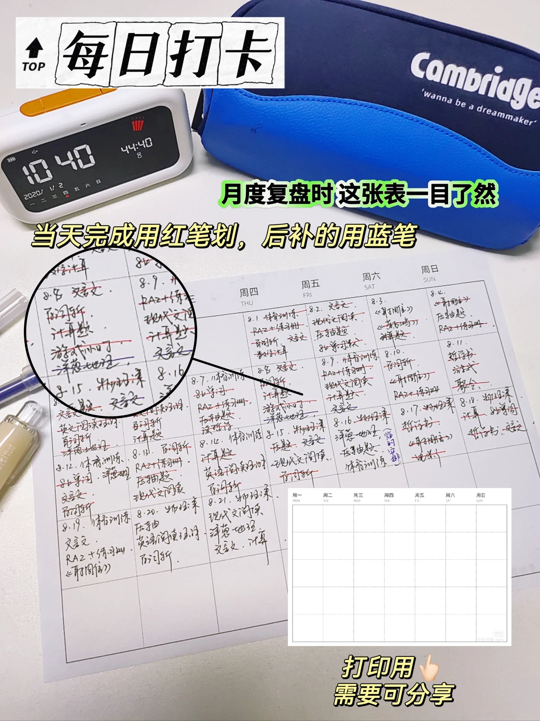 当天没做完的,di二天在完成既定打卡基础上,要补上前一天的。因为有了每日打卡表,所有任务一目了然。到了月末,就可根据这张表来做月度复盘了