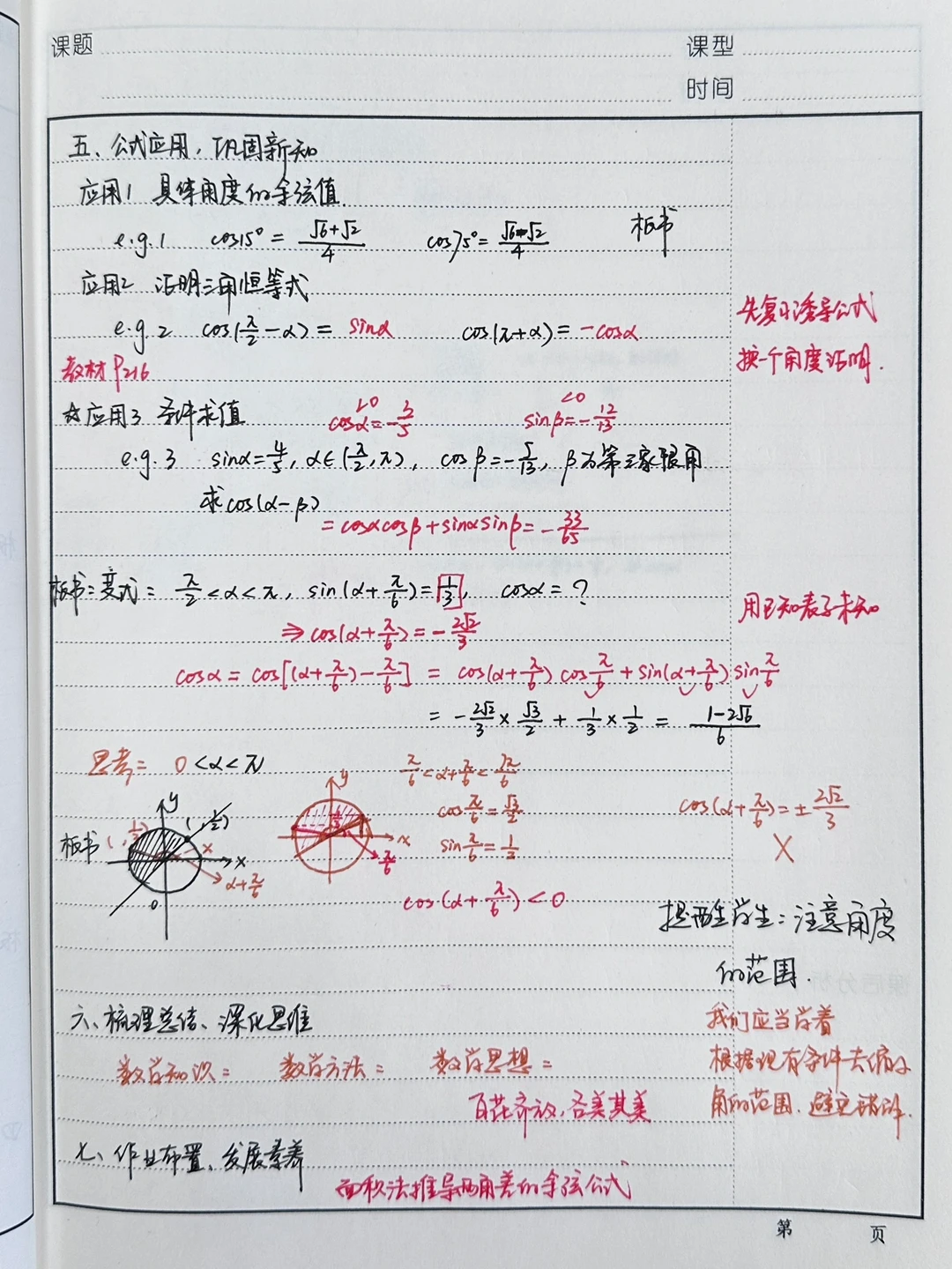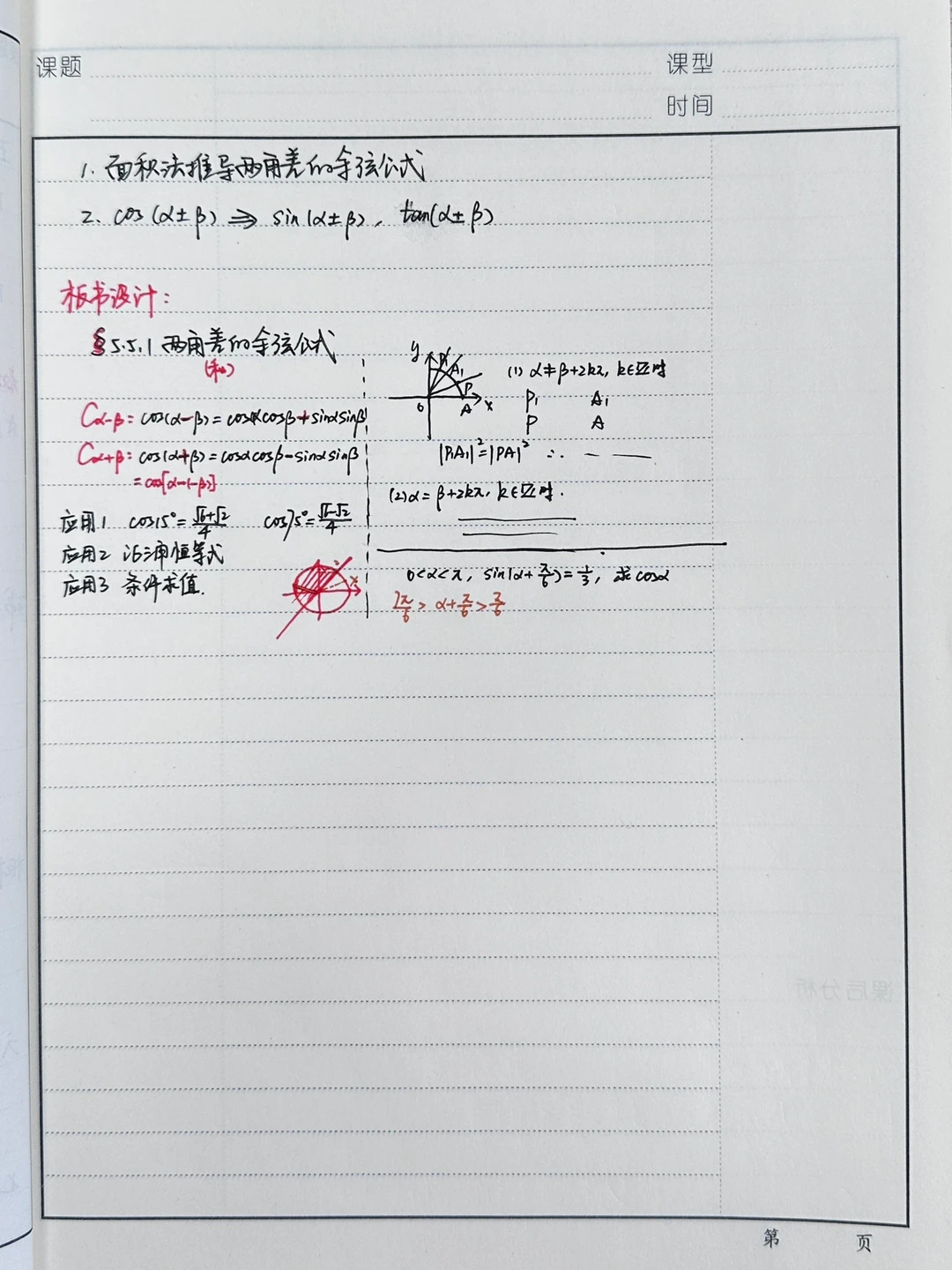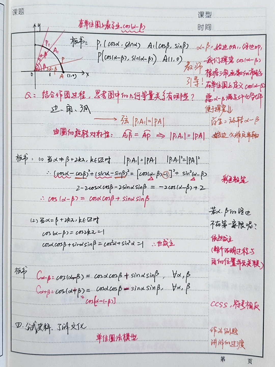 上公开课还是会有点紧张,总觉得没有常规课那么自然,我希望能做到流畅自如,学生有回应~ 两角差的余弦公式是三角恒等变换的基础,整堂课采用问题串的形式引导学生去探究证明这个公式,再对这个公式进行应用,例题由易到难,想通过最后一个变式让学生学会用已知三角函数值去缩小角度范围,避免出错。