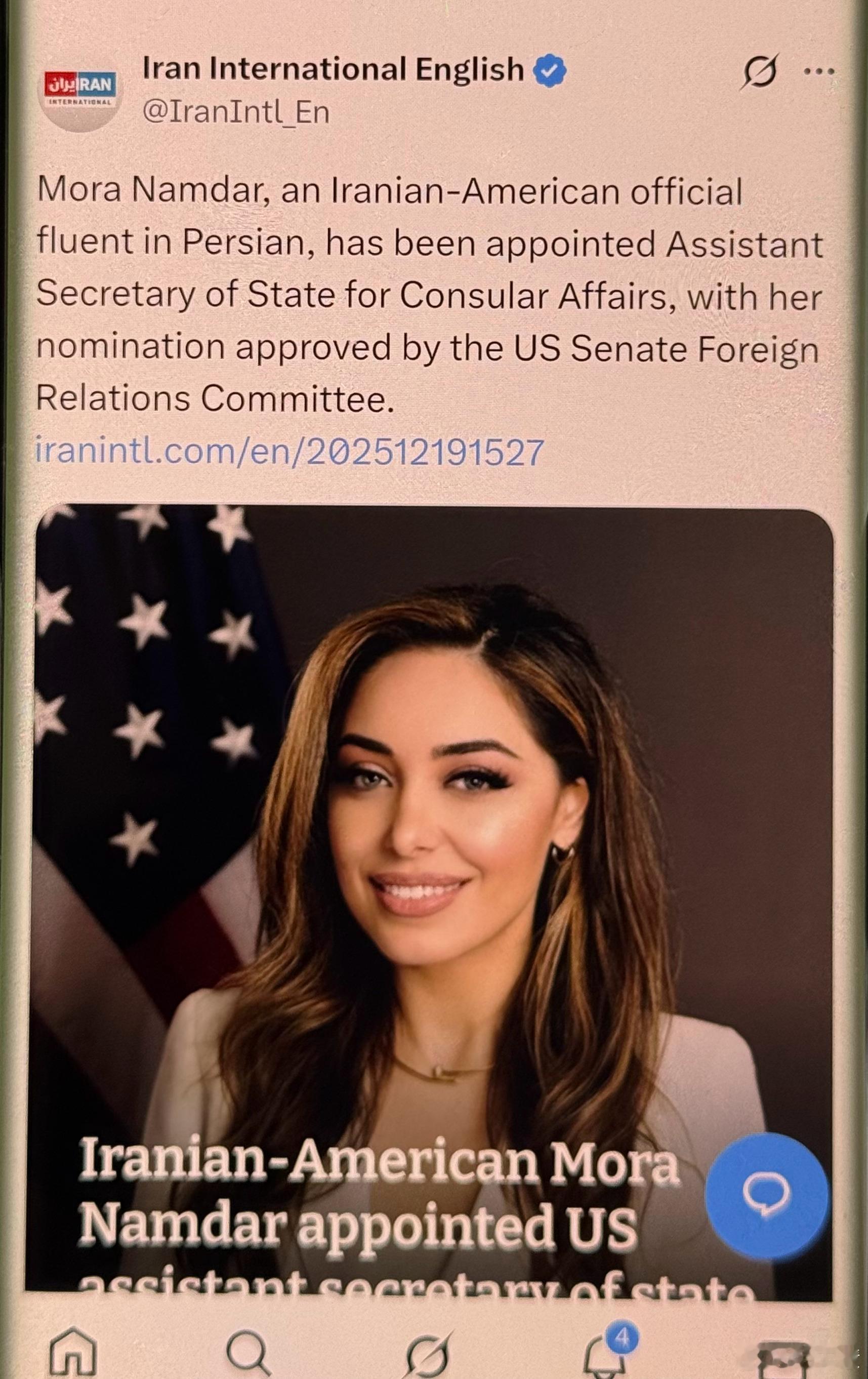 快讯!精通波斯语的伊朗裔美国官员莫拉·纳姆达尔被任命为负责领事事务的助理国务卿,她的提名得到了美国参议院外交关系委员会的批准。慧眼辣评 :简直太漂亮了!特朗普内阁成员都是高颜值的!