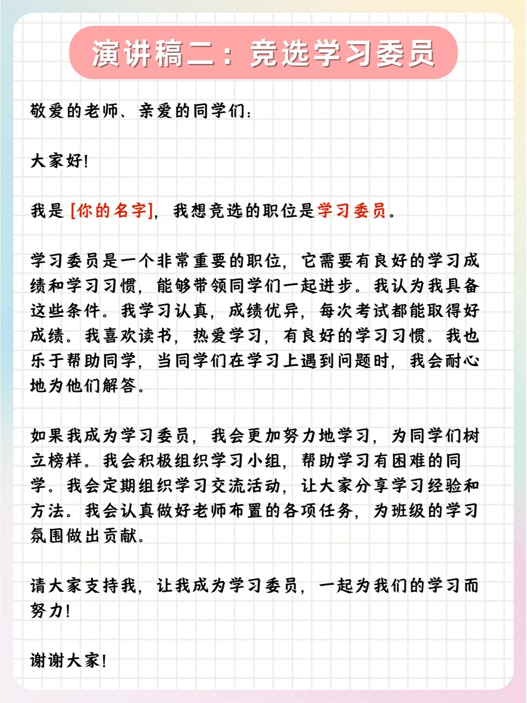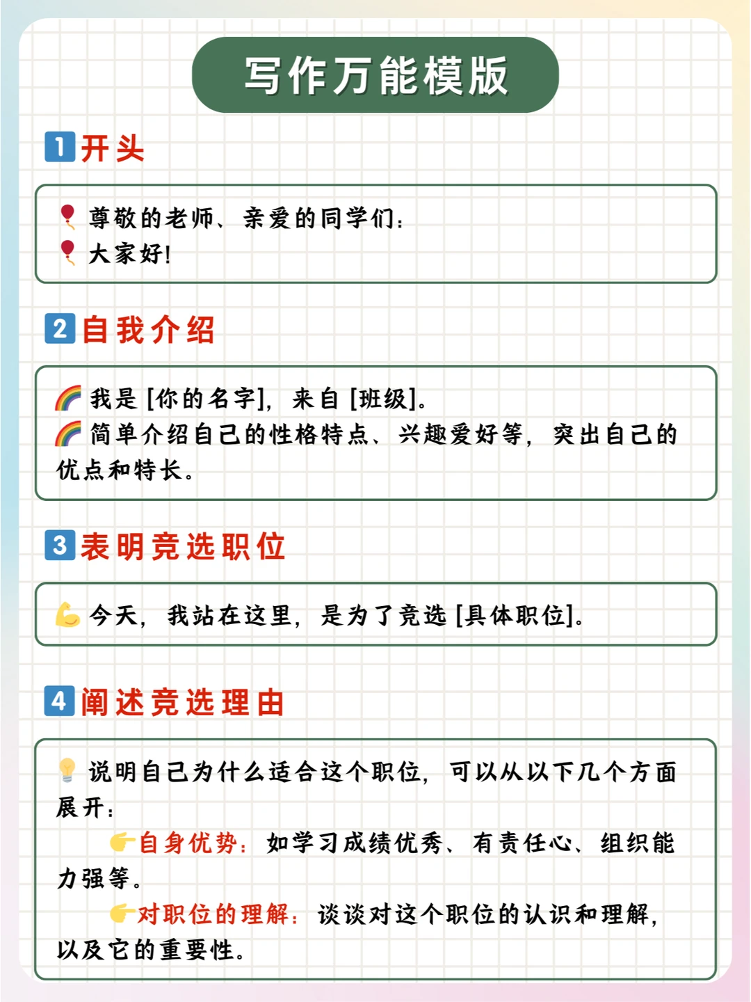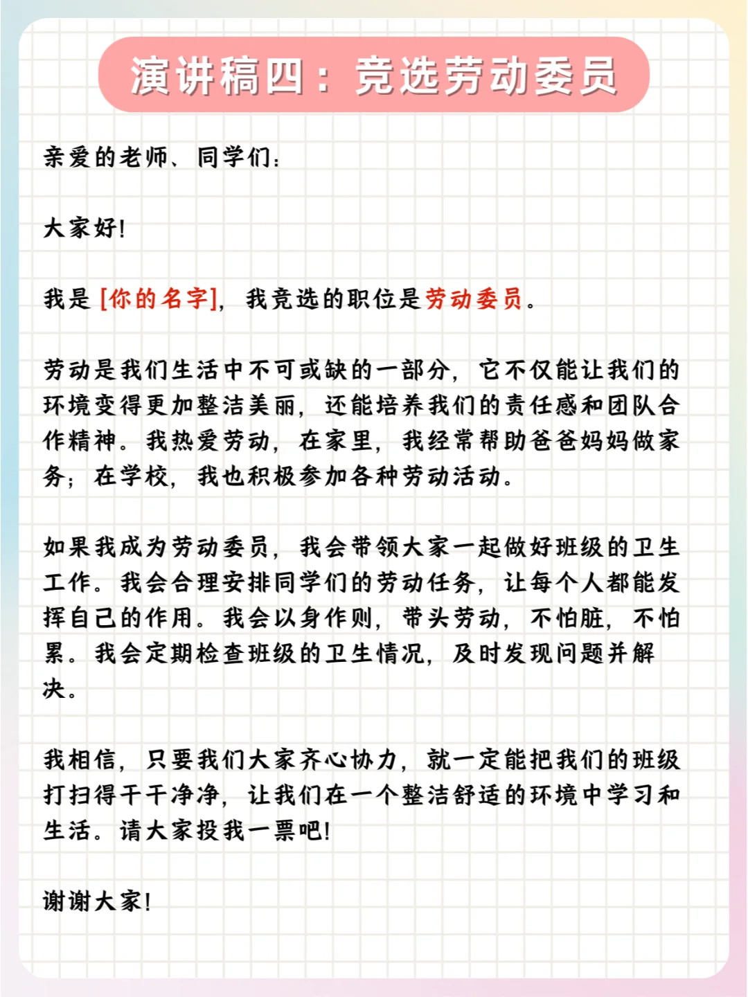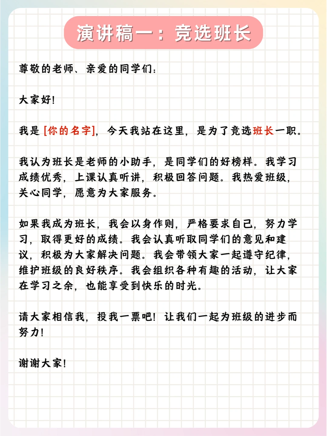 📝总之,孩子们可以根据实际情况,对公式中的内容进行具体的填充和调整,以满足不同职位竞选的需求。