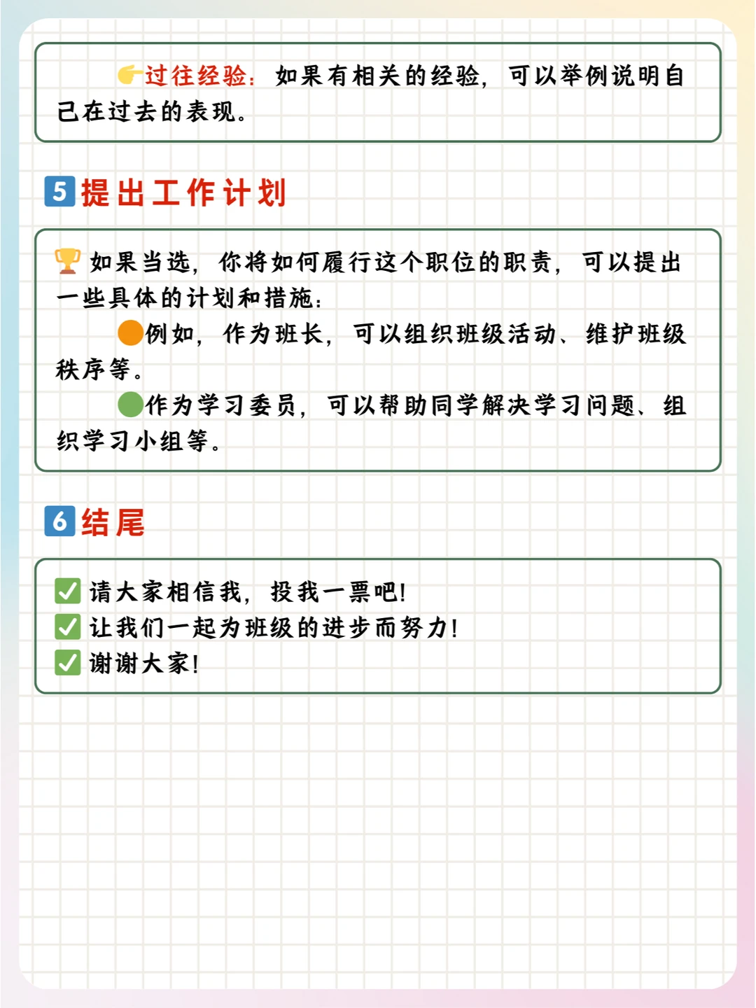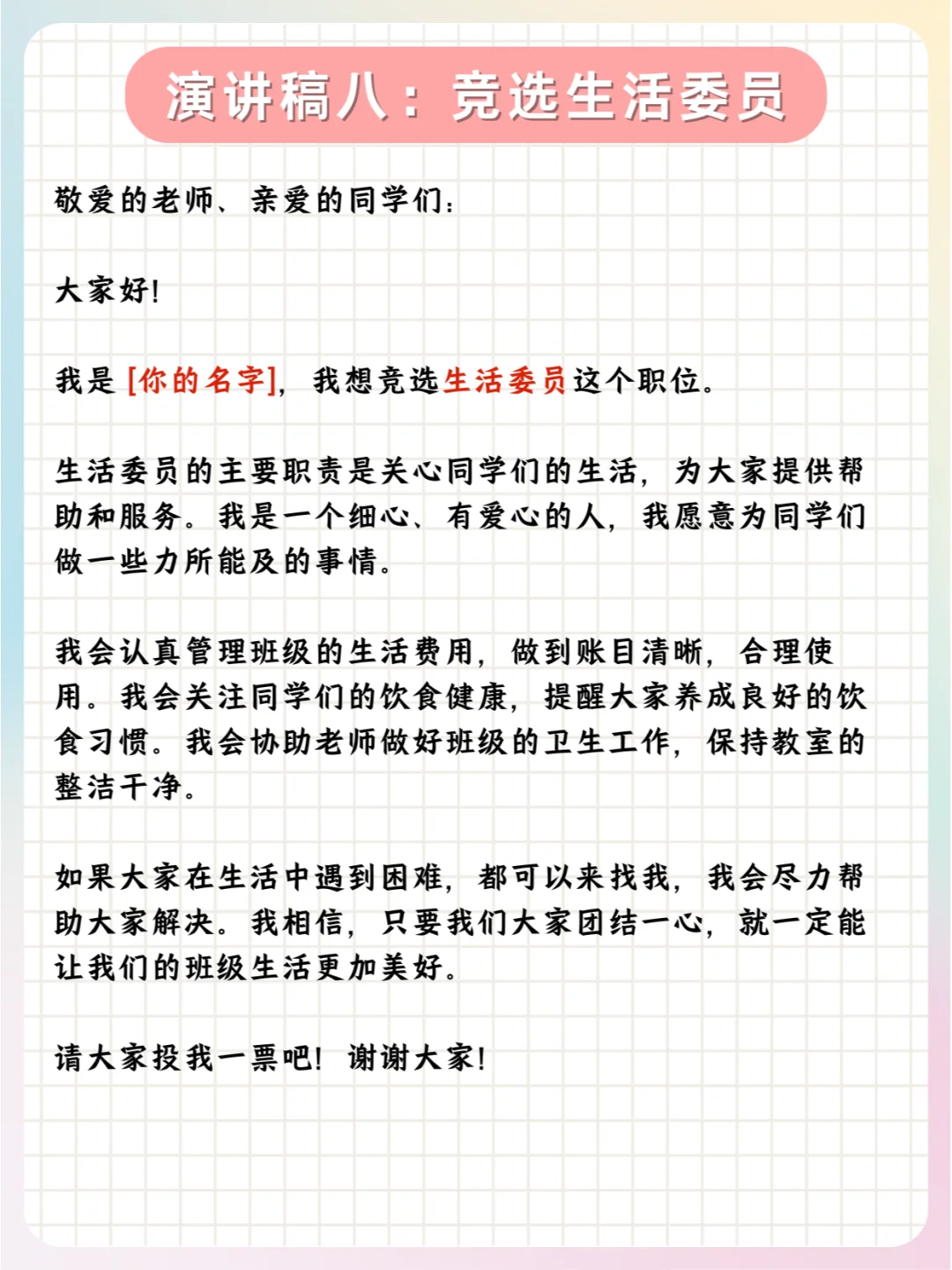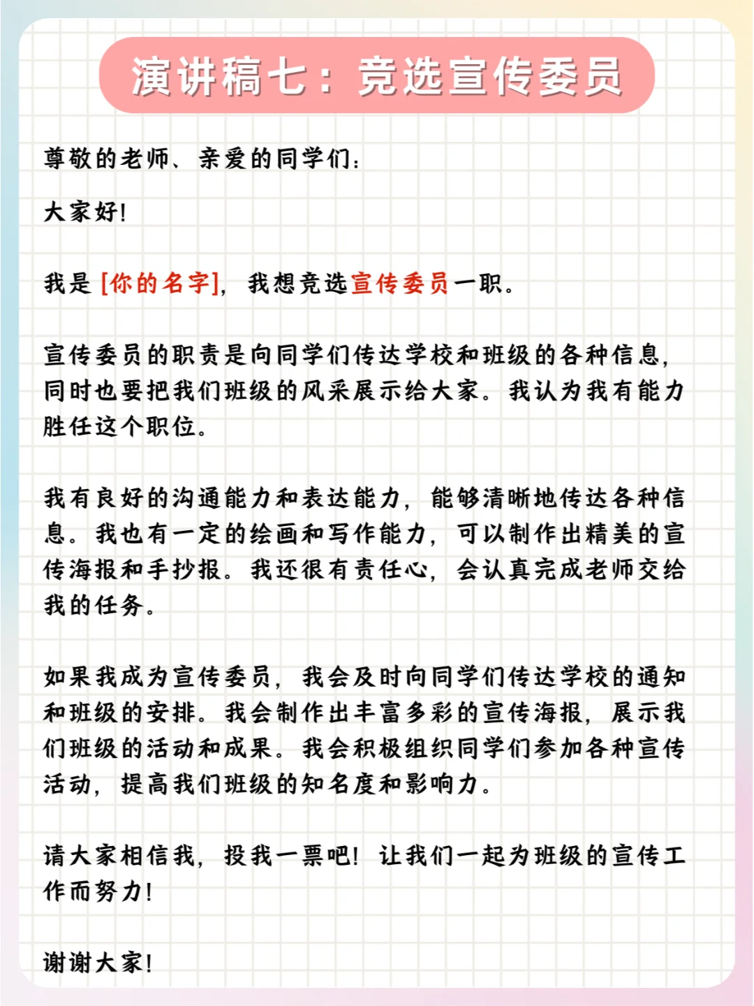 📝总之,孩子们可以根据实际情况,对公式中的内容进行具体的填充和调整,以满足不同职位竞选的需求。