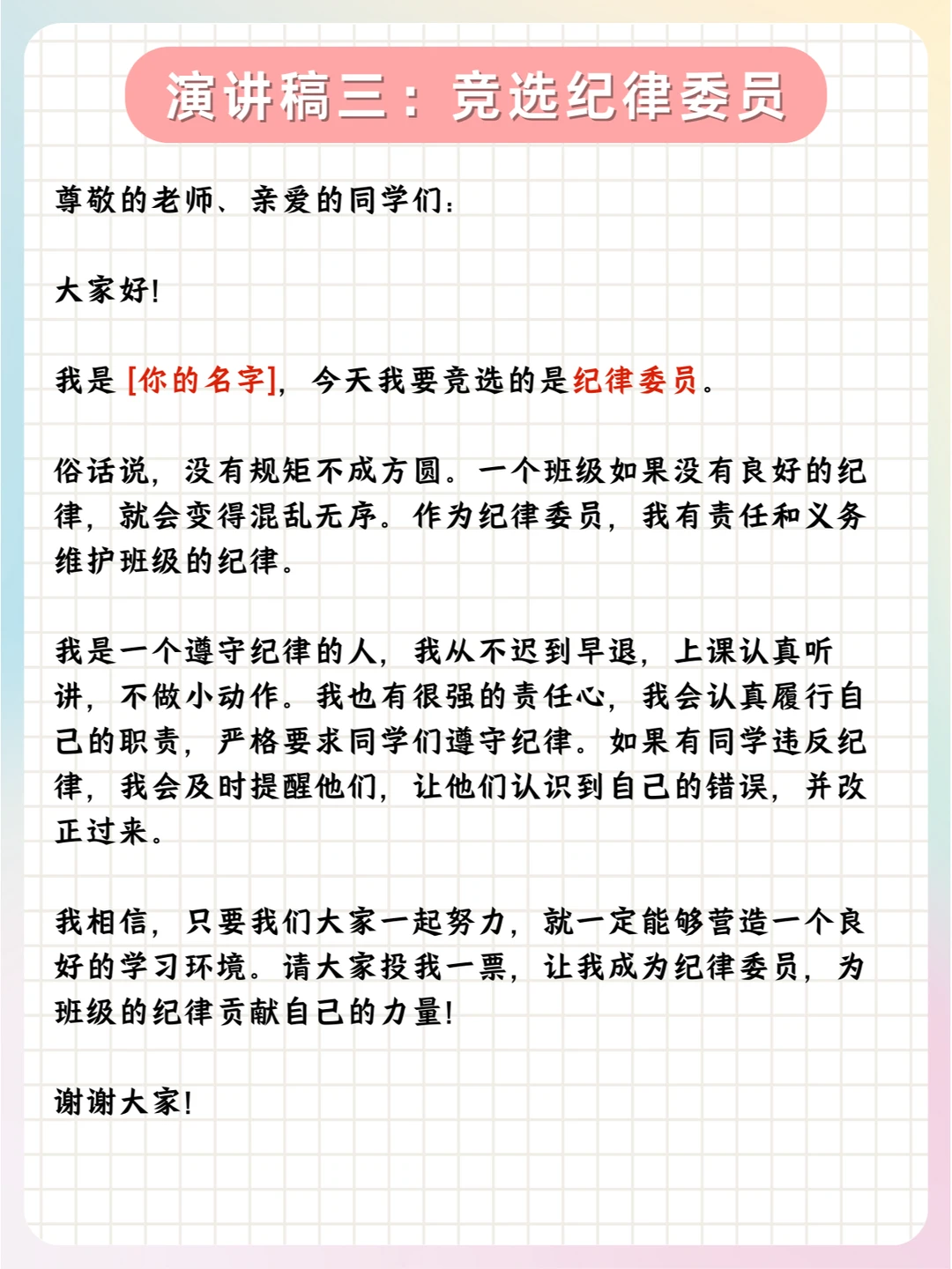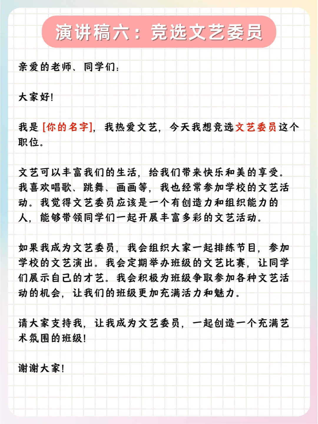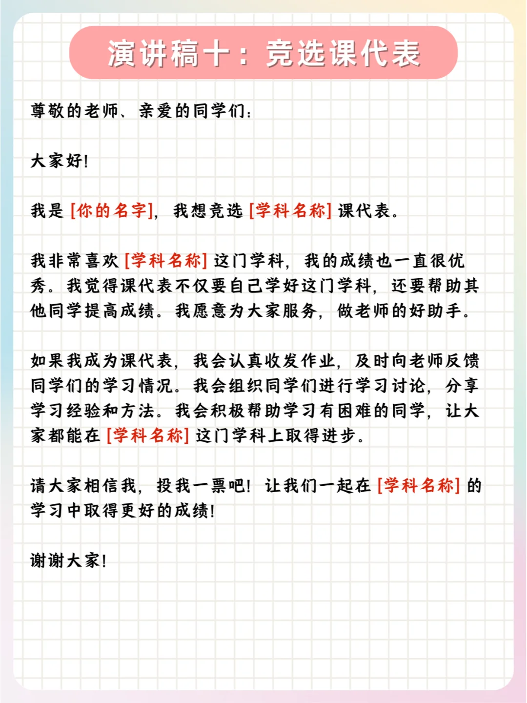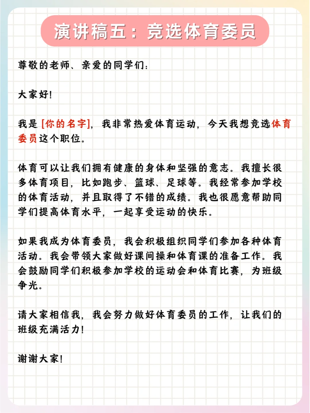 📝总之,孩子们可以根据实际情况,对公式中的内容进行具体的填充和调整,以满足不同职位竞选的需求。